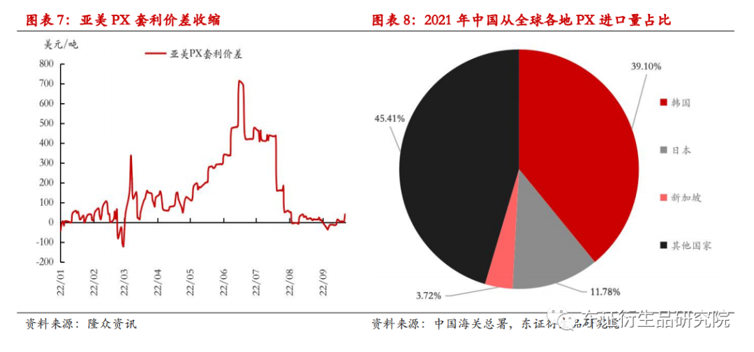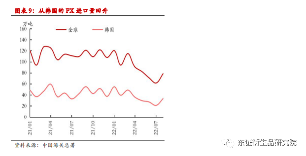 亚美PX套利空间缩小, 日韩至中国的PX出口量逐步恢复。自五月份起,美国季节性调油需求旺盛,其境内PX供应也大幅缩减,对外进口的依赖度也就相应提升。而六月之前亚洲PX供应端都是相对宽松的环境,基本面的差异使得美国与亚洲的PX价差不断扩大,导致亚洲PX产品更倾向于出口到美国套利,4-8月韩国出口美国23.73万吨PX,而2021年出口到美国的总数量也仅5.38万吨。原来主要流向中国的PX产量被转移到了美国市场,导致国内供需格局被打破,价格走势上涨。随着亚美PX套利价差的不断收缩,出口美国的部分已逐步回流至中国市场,韩国7月出口美国13万吨、中国26万吨,而8月出口美国1万吨、中国35万吨。因此,预计四季度国内PX紧缺状况因回流的进口量得以改善。