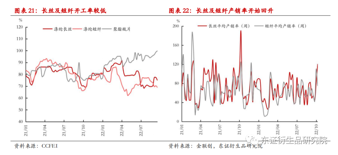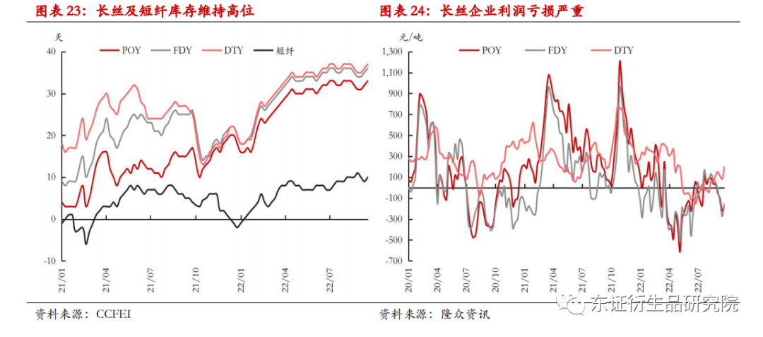 纺服的库存和利润压力也同样直接映射到聚酯生产企业。由于PTA原料主要用于生产长丝、短纤及瓶片,分别占比64%、12.5%、18%,这三个领域的生产表现直接决定PTA总需求,尤其是长丝生产企业。分品类来看: