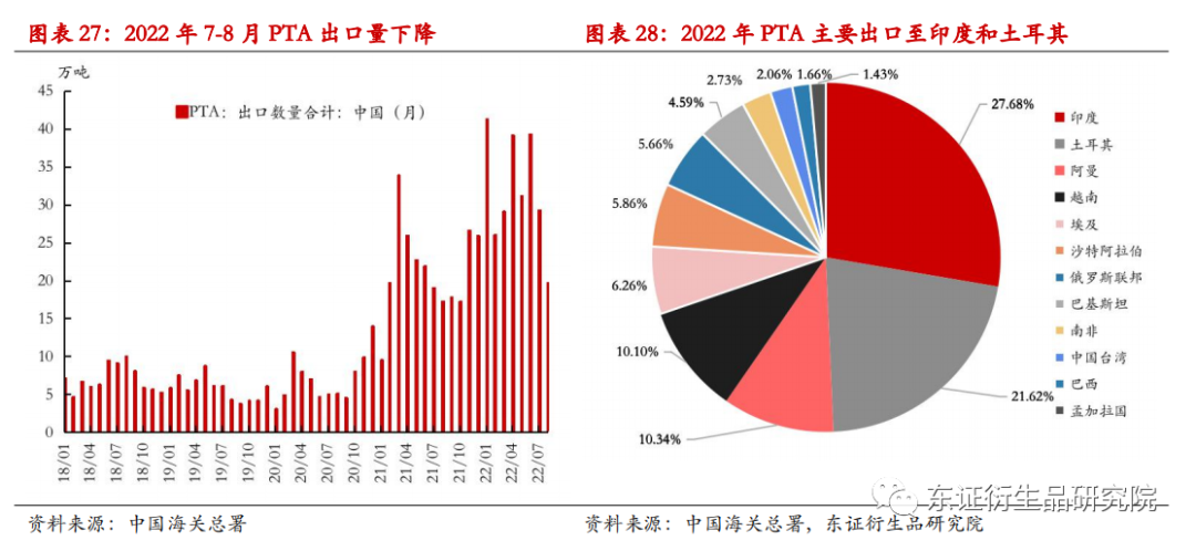 全球宏观环境明显疲弱,PTA出口量下降明显。2021年以来,印度等国家的PTA供应缺口扩大,而我国大型装置的成本竞争力较强,导致PTA出口的持续上行。2021年全年出口257.5万吨,2022年1-8月出口254.9万吨,其中,印度和土耳其为主要出口国,分别占比27.68%、21.62%。业内曾认为PTA出口可能成为未来消化行业过剩产能的新通道。然而,三季度美国鹰派加息超预期,随后美元指数大涨,原油再度回调,全球衰退超预期进行中。在整体宏观氛围偏空的背景下,PTA的海外需求下行也提前到来。7、8月PTA出口量出现了比较直观的下降,总出口量已从6月的39.3万吨降至8月的19.7万吨,其中,印度及土耳其的出口量分别从6月的12.4万吨、14万吨下降至1.5万吨、0万吨。