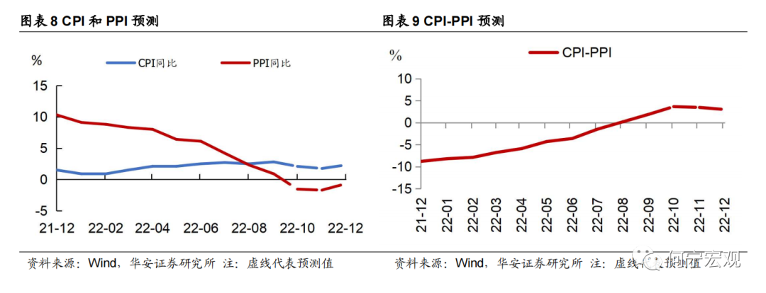 高频数据看,截至10月13日食品价格较上月总体下降,特别是蔬菜水果降幅较大,猪肉价格环比继续上涨3%;疫情等因素可能继续压制消费恢复,非食品暂按略低于季节性假设,初步预测10月CPI同比将下行至2.1%左右。再往后,虽然猪价仍趋上行,油价高位震荡,但疫情、消费等压制下,核心通胀承压,非食品通胀表现可能不及季节性,因此年内高点应已经出现,四季度CPI同比预计先下后上,整体在1.5%-2.5%之间波动,全年累计同比在2.0%左右。