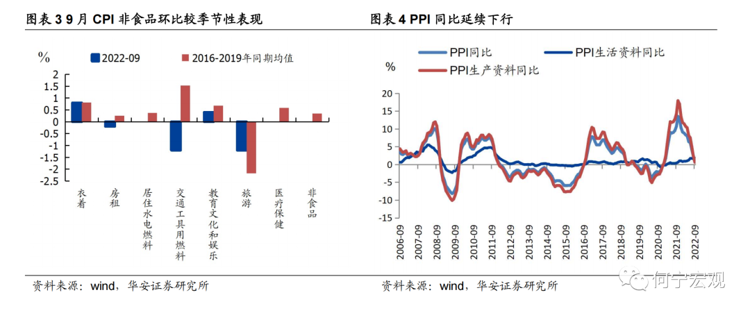 2)非食品项:在衣着上市涨价、交通工具燃料降幅收窄、教育服务价格上涨的支撑下,9月非食品环比降幅收窄。不过,房租、教育医疗服务弱于季节性,指向消费就业仍承压。比较反常的是,旅游价格环比下降,但好于季节性。结合国庆旅游消费数据预计10月旅游价格可能承压。