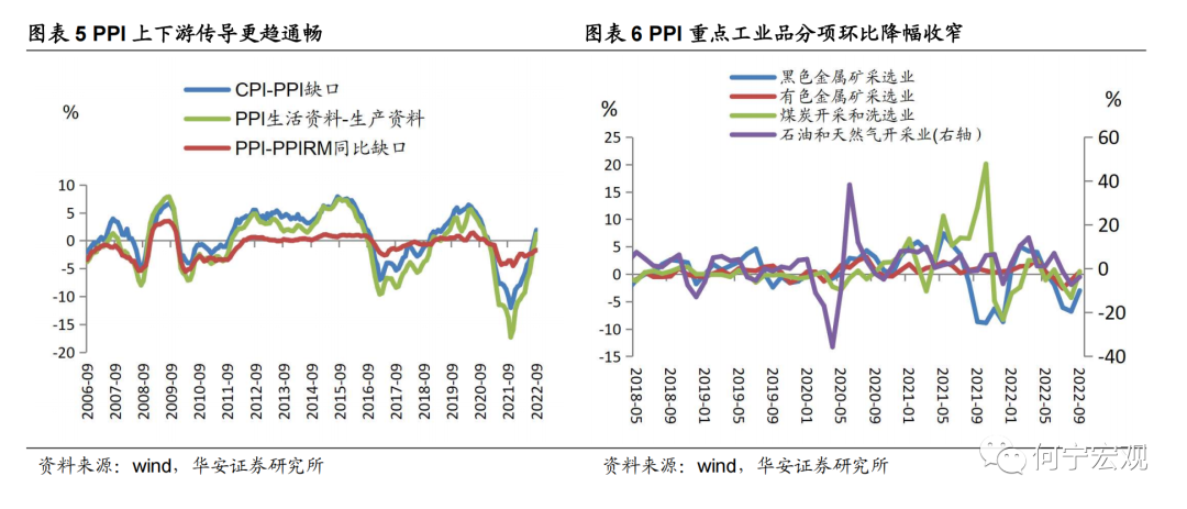 美联储鹰派加息导致市场对未来衰退预期增加,需求下降拖累国际油价继续下跌,布伦特原油期货价格9月环比下降7.3%,WTI原油期货环比下降8.2%,对应PPI石油和天然气开采业、石油加工、化学制品、化学纤维等行业价格环比继续下降,但总体降幅收窄。
