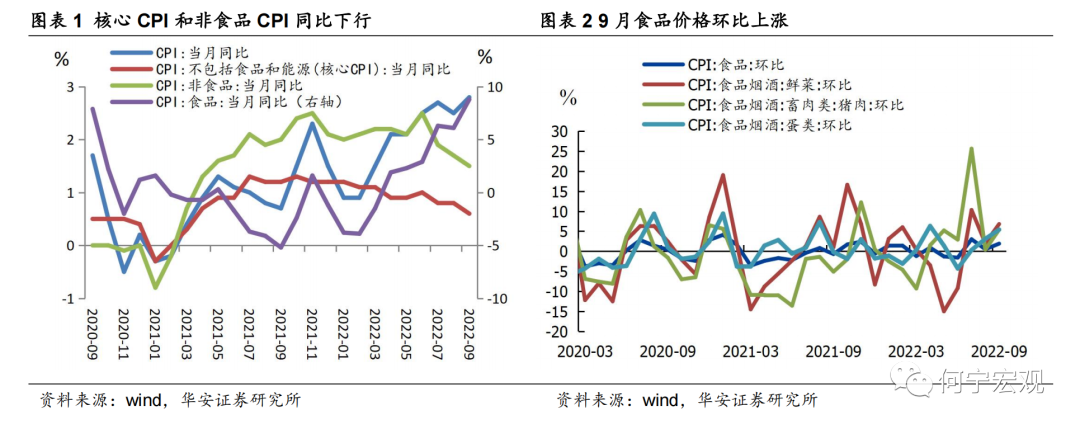 9月剔除食品和能源的核心CPI同比较前值回落0.2个百分点至0.6%,环比0%,核心通胀承压。结合CPI服务环比下降,服务业PMI回落3个百分点至48.9%、中国企业经营状况指数(BCI)环比下降1.1个百分点至45%来看,疫情对服务业、中小企业的压制也制约了核心CPI的增长。