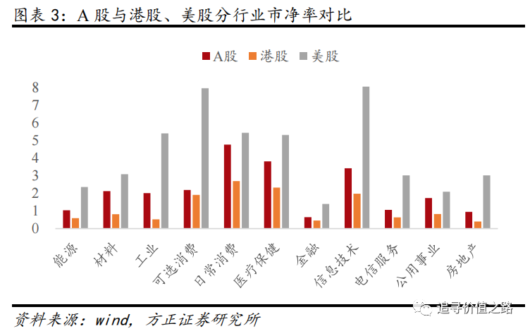 从A股与港股、美股的市净率对比来看,A股市场的金融(市净率:0.65倍)、电信服务(市净率:1.07倍)、能源(市净率:1.04倍)以及房地产(市净率:0.95倍)行业市净率均显著低于美股的相应行业市净率(金融1.39倍、电信服务3.02倍、能源2.36倍、房地产3.01倍)。A股在材料、工业、可选消费、日常消费、医疗保健、信息技术、公用事业等行业的市净率也普遍低于美股市场。而港股市场在各个一级行业中的市净率则普遍低于A股市场。
