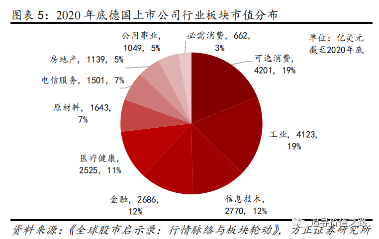 截至2020年底,德国法兰克福证券交易所本地上市公司共计438家,由于德国间接融资体系占主导,企业倾向于从银行贷款,因此历史上的上市公司数量从来未超过1000家。在德国上市公司中,按照行业板块来分,市值占比最大的是可选消费板块,市值占比高达19%,其次是工业板块市值占比19%,然后是信息技术和金融。