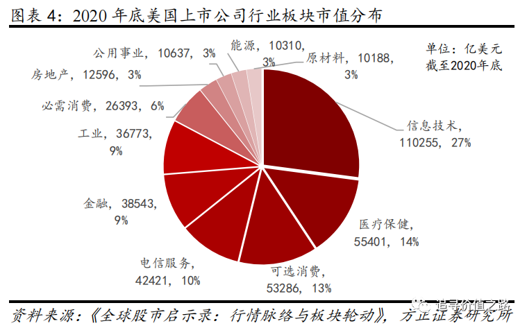 根据世界银行的统计数据,截至2020年底,美国本地上市公司共计4219家。在美国本地上市公司中,按照行业板块来分,市值占比最大的是信息技术板块,市值占比超过四分之一,其次是医疗保健和可选消费,市值占比分别为14%、13%,然后是电信服务和金融。