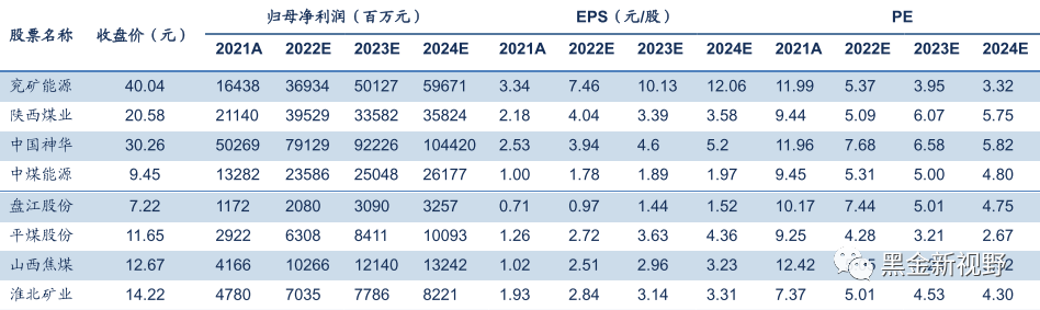 资料来源:Wind,信达证券研发中心 注:兖矿能源、陕西煤业、中国神华、山西焦煤、平煤股份、盘江股份的归母净利及EPS为信达预测,其他采用万得一致预期。数据截至2022年11月27日。