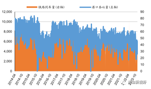 图 19:秦皇岛港铁路到车量及港口吞吐量(万吨)