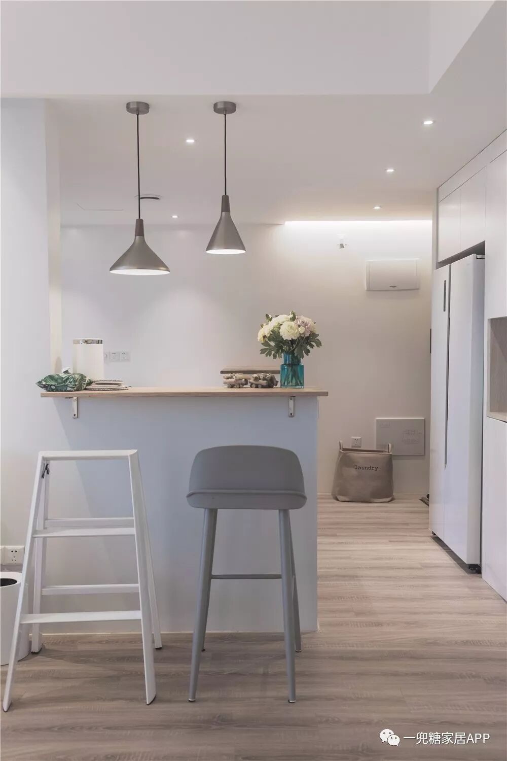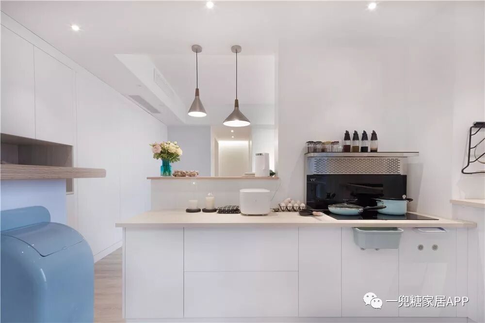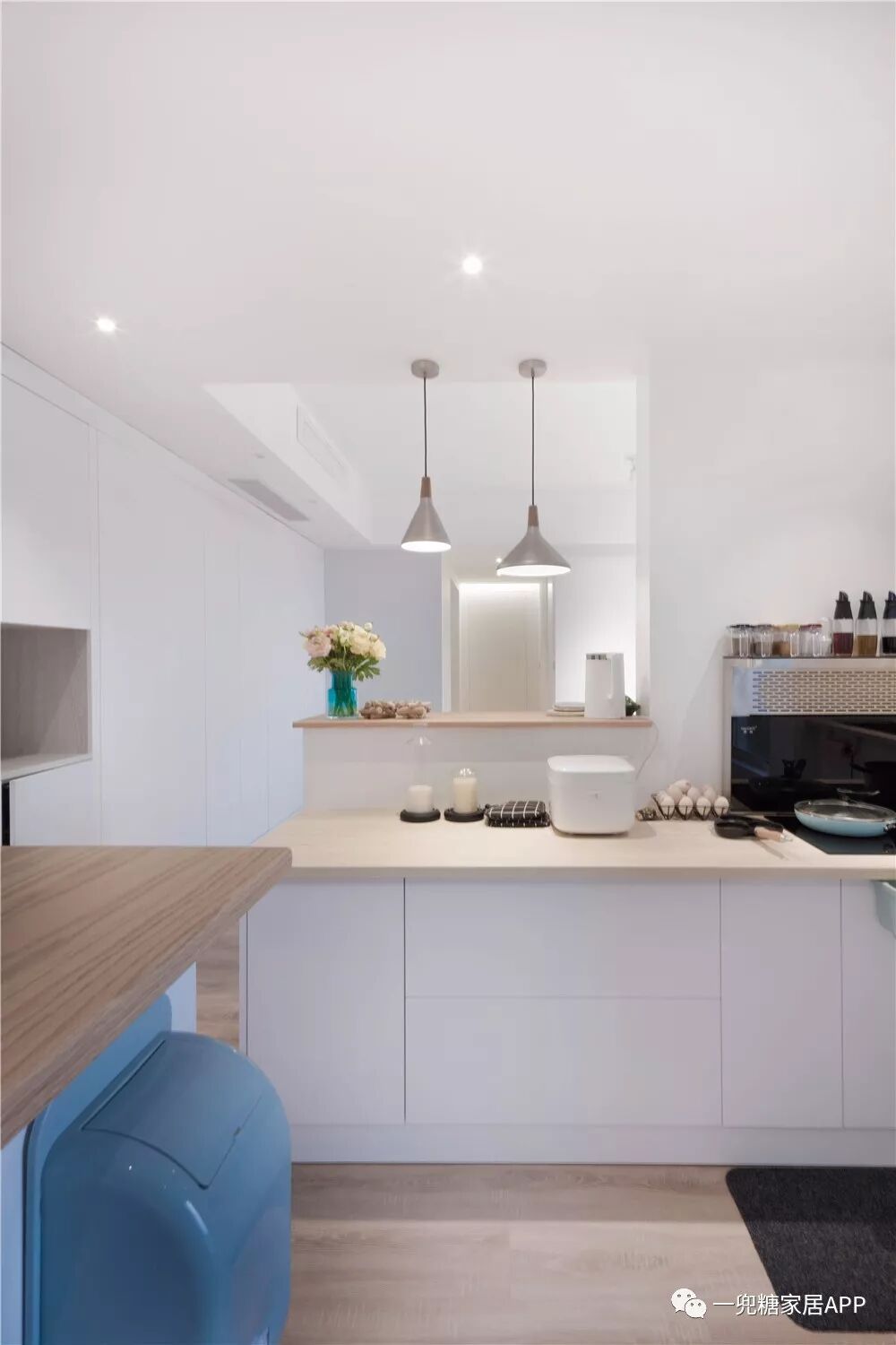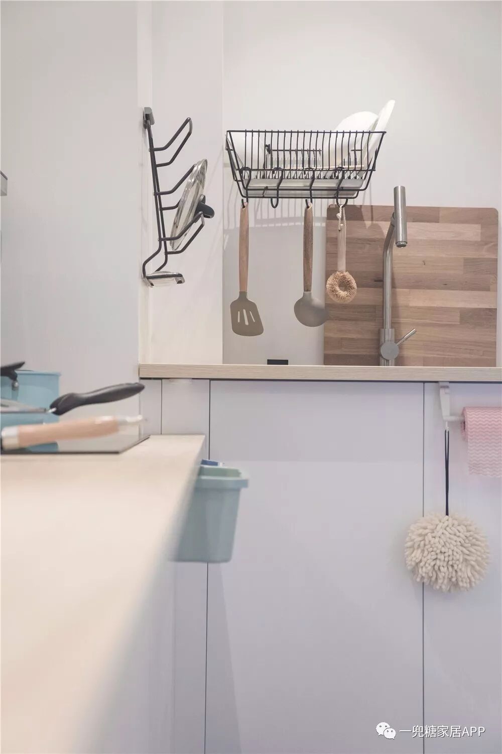 他家的收纳柜全部采用无把手设计,降低存在感,看起来更加干净。 橱柜也是如此,按压式开关。一方面更简约高级,另一方面,也更好打理卫生。