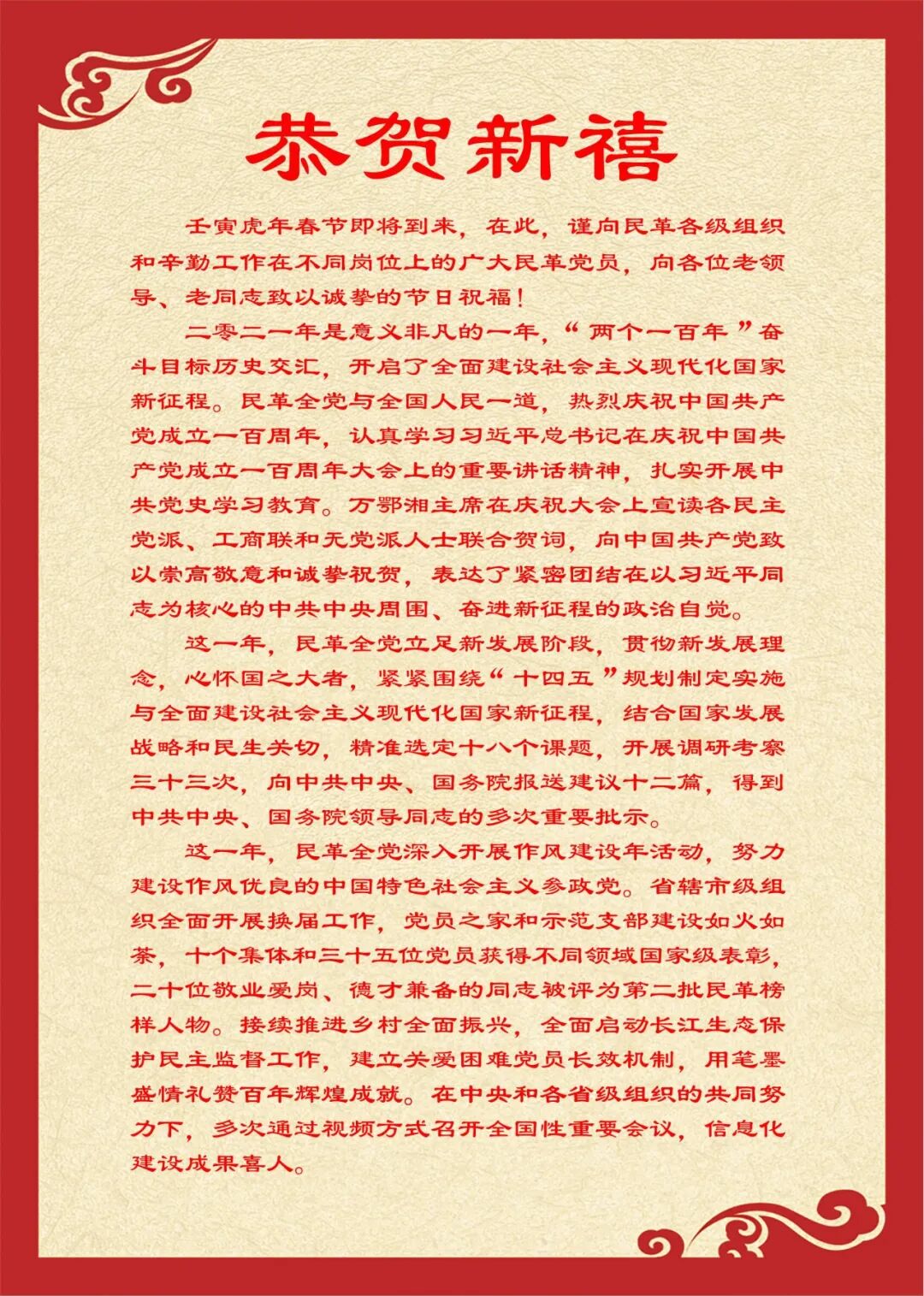 壬寅虎年春节即将到来,在此,谨向民革各级组织和辛勤工作在不同岗位上的广大民革党员,向各位老领导、老同志致以诚挚的节日祝福!