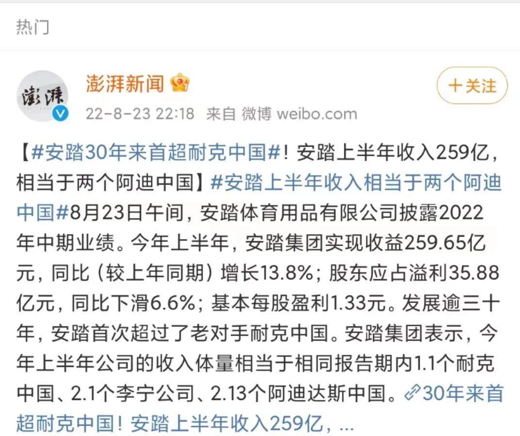 运动服饰圈真是一浪接着一浪,前脚阿迪达斯业绩连续下滑后,其CEO承认在中国犯了错误,后脚安踏首次超过了老对手耐克中国,打破“耐克+阿迪达斯”双王局面,坐上国内市场行业龙头交椅。这背后是安踏2022年中期业绩报告给出的答案:上半年实现收益259.65亿元,同比(较上年同期)增长13.8%,这半年的收入体量相当于相同报告期内1.1个耐克中国、2.13个阿迪达斯中国!![]()