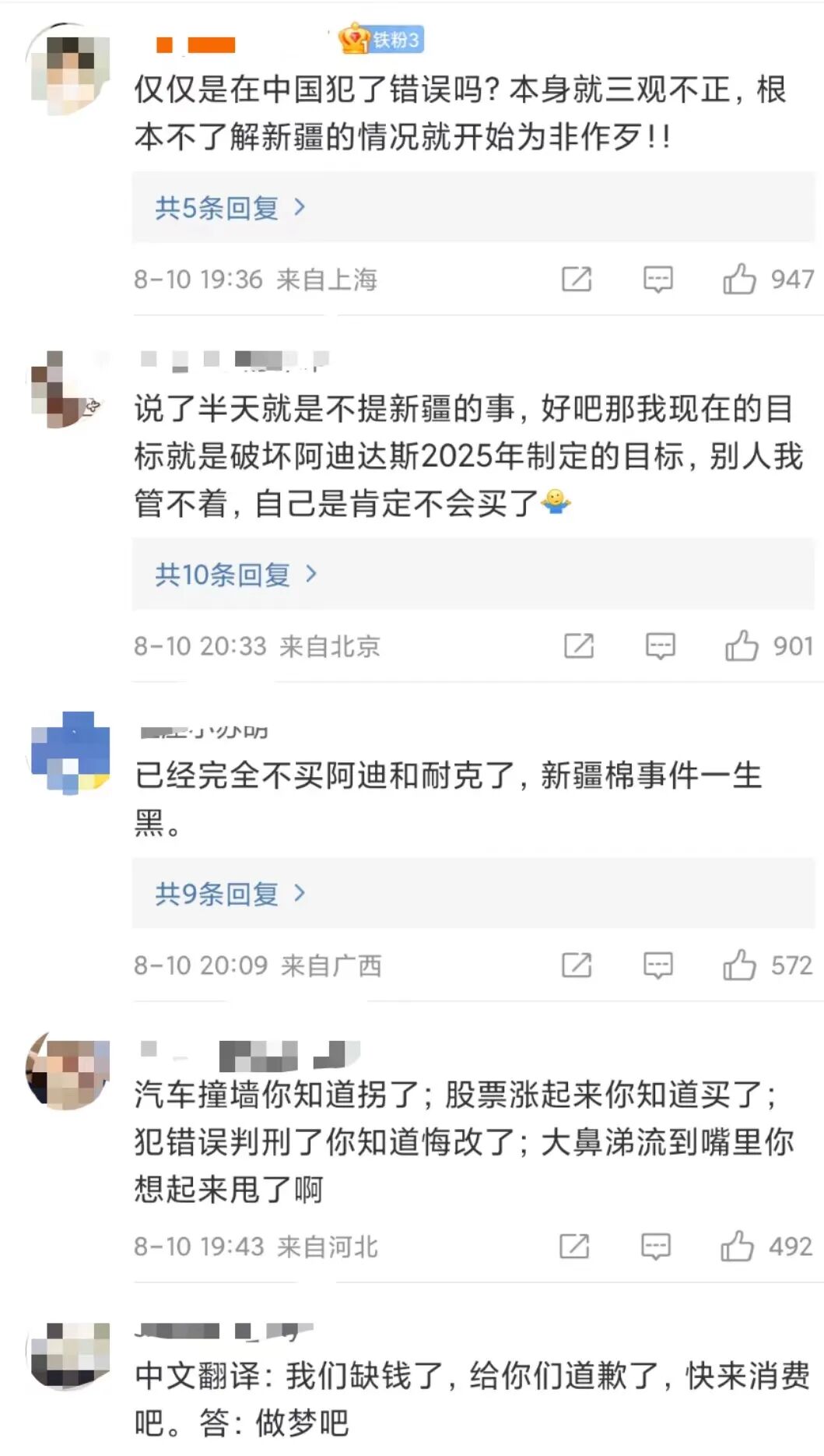 作为诞生于福建晋江的本土“瓜娃子”,安踏升级路上是怎么挥刀“夺冠”的呢?效仿诸葛亮借东风获得一船的箭,安踏名气不大就敢冒着资金断裂的风险,选择孔令辉拍摄广告,借其作为冠军的知名度,以一句“我选择,我喜欢”赚得盆满钵满。正如安踏创始人丁世忠决定的一样:“是知道安踏的人多,还是知道孔令辉的人多?”可见,在选择代言人方面,安踏的老大颇有见解和胆量。对比之下,阿迪达斯陷入闹得沸沸扬扬的抵制新疆棉事件,在一夜之间失去13位品牌代言人。之后,业绩和股价双双“滑铁卢”。阿迪达斯第一季度大中华区收入暴跌35%,这已经是自2021年第二季度以来,在大中华区销售额连续第五季度的下滑;另外,股价也跌去近44%,阿迪达斯正在遭受资本市场的抛弃。不肯低头的阿迪达斯最终不得不承认自己在中国犯了错误。虽然阿迪达斯CEO罗思德相信“中国市场会归来”,但是从中国消费者的反馈来看,怕是难了。即使过去了一年多的时间,消费者依旧对阿迪达斯、耐克等参与新疆棉事件的品牌都没有好感。![]()