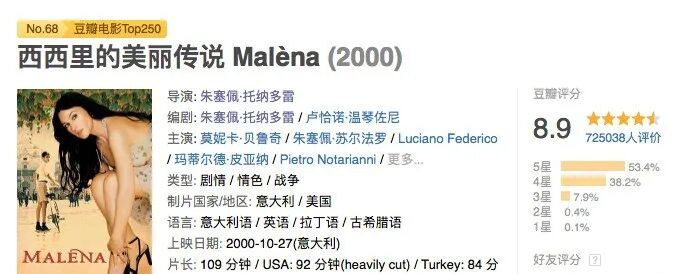 假如观众可以把思虑从贝鲁奇美丽的胴体上移开,就会留下比贝鲁奇的乳房更触目惊心的印象——人民的无耻。就在这美丽的意大利小镇上,一帮看似善良的居民,一个美丽的弱女子玛莲娜,男人们的贪婪和虚伪,女人的嫉妒和蛮横,流言、排斥以及现实的残酷终于把玛莲娜赶出小镇。