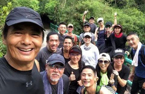 发布了一张带着众明星去爬山的照片。