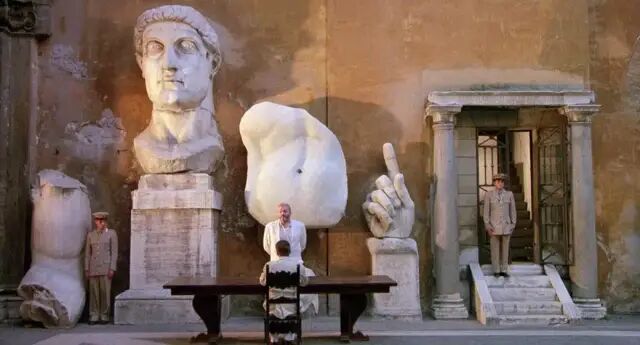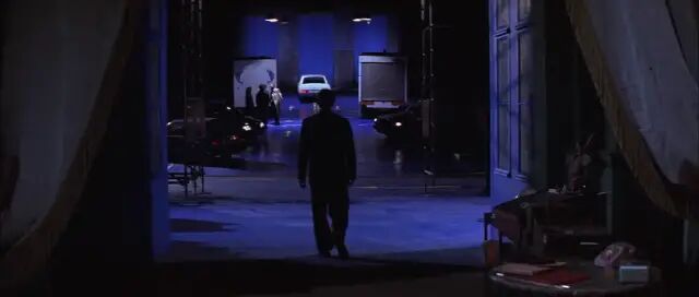 除了迈克尔的书库外,其他场景均是舞台化的非常规布景,尤其是纵深的空旷感,使人好似置身戏院一般。