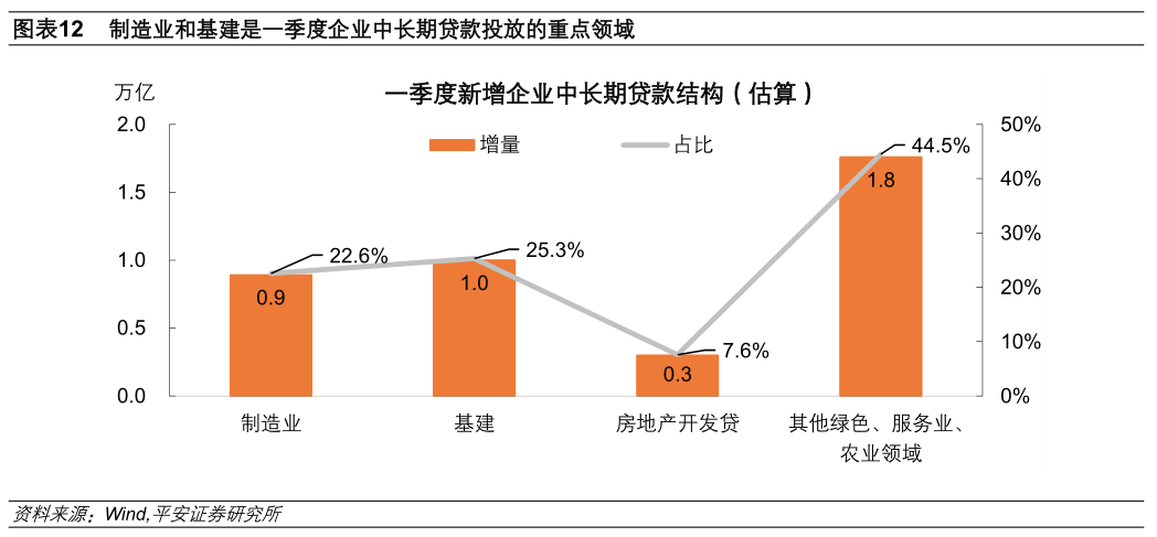 四是,其他领域贷款投放约占一季度企业中长期贷款44.5%。除制造业、基建、地产之外的其他领域主要包括绿色领域(不含基建)、不含地产基建的服务业(批发零售、住宿餐饮等)、农业等,相关贷款投放约占一季度企业中长期贷款44.5%。由于一季度的金融机构贷款投向统计报告尚未公布,我们难以进行详细的拆分,相关贷款的增量或源于两方面原因:一方面,在碳减排支持工具与煤炭清洁生产再贷款支撑下,绿色领域(不含基建)的中长期贷款或是一季度企业中长期贷款的重要增长点;另一方面,一季度支农支小再贷款的投放量为1158亿元,支撑着农业、批发零售、住宿餐饮等行业的贷款增量。