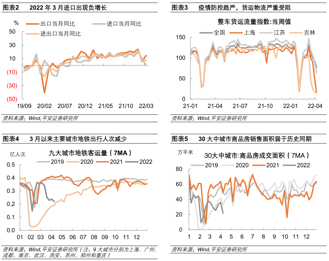 三是,从高频数据来看,新冠疫情多点爆发冲击消费、影响供应链稳定,地产高频数据仍在磨底。3月以来主要城市出行人次急剧减少,截至4月9日当周九大城市地铁客运量已接近于春节期间水平,上海、吉林两大疫情严重城市整车货运流量指数已降至春节期间最低点。目前疫情最为严重的上海,作为全球第一大集装箱港口、全国半导体企业的聚集地、及国内重要的汽车及汽车零部件生产基地,其严格管控措施对国内供应链稳定构成威胁。尽管今年以来,越来越多的城市积极调整房地产限购限贷政策、按揭贷款利率、集中供地规则等,但当前商品房销售及土地成交尚未企稳,居民和房地产企业的信心仍有待恢复。