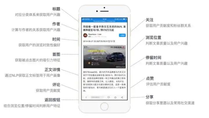 我之前分享过所有的内容平台是如何在用户的不知不觉中获取用户信息的。下图就呈现了当用户点开一篇内容的详情页时,推荐系统从内容的不同字段来获取用户兴趣和特征的。