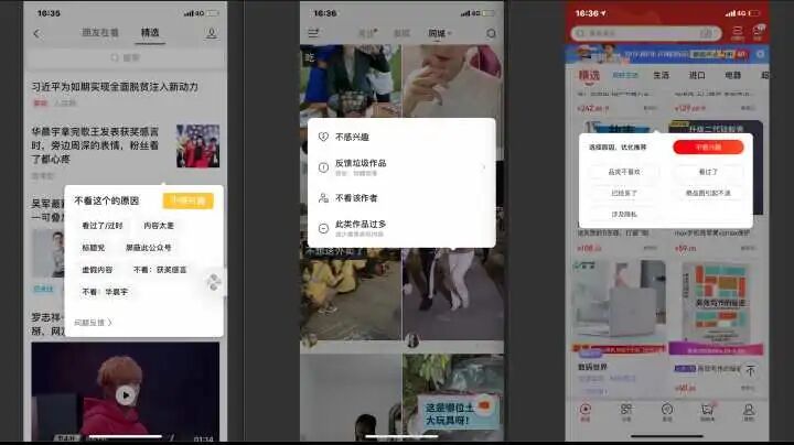 几乎所有的推荐场景下,都会留有”不感兴趣“、”减少此类内容“、”不喜欢“等,用户一旦点击即告诉推荐系统:这不是我要的内容。推荐系统会果断减少此类内容的推荐,更会将”用户不喜欢xx“刻入用户画像永久保存。