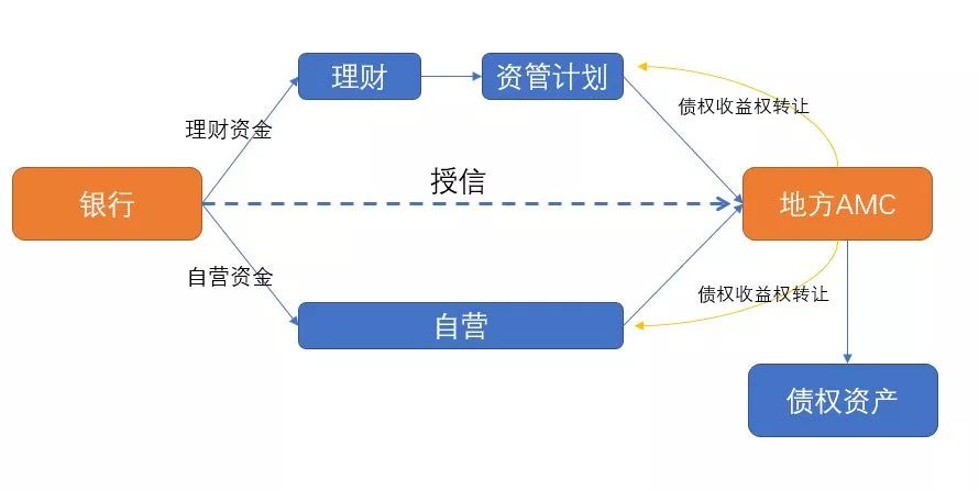 在通道模式被禁止之后,在2017年左右,有地方AMC通过向银行转让其买断的债权资产收益权的方式进行融资。该类模式代持模式有点类似,地方AMC向银行转让债权收益权,但是区别在于是地方AMC远期回购该资产,而不是银行,即该资产的风险由地方AMC承担。
