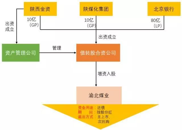2016年底,陕西金资、陕煤化和北京银行协议分别出资10亿、10亿和80亿成立债转股合资公司,合资公司100亿元债转股资金对陕煤化全资子公司陕西陕煤榆北煤业有限公司(以下简称“榆北煤业”)进行注资,完成债转股。