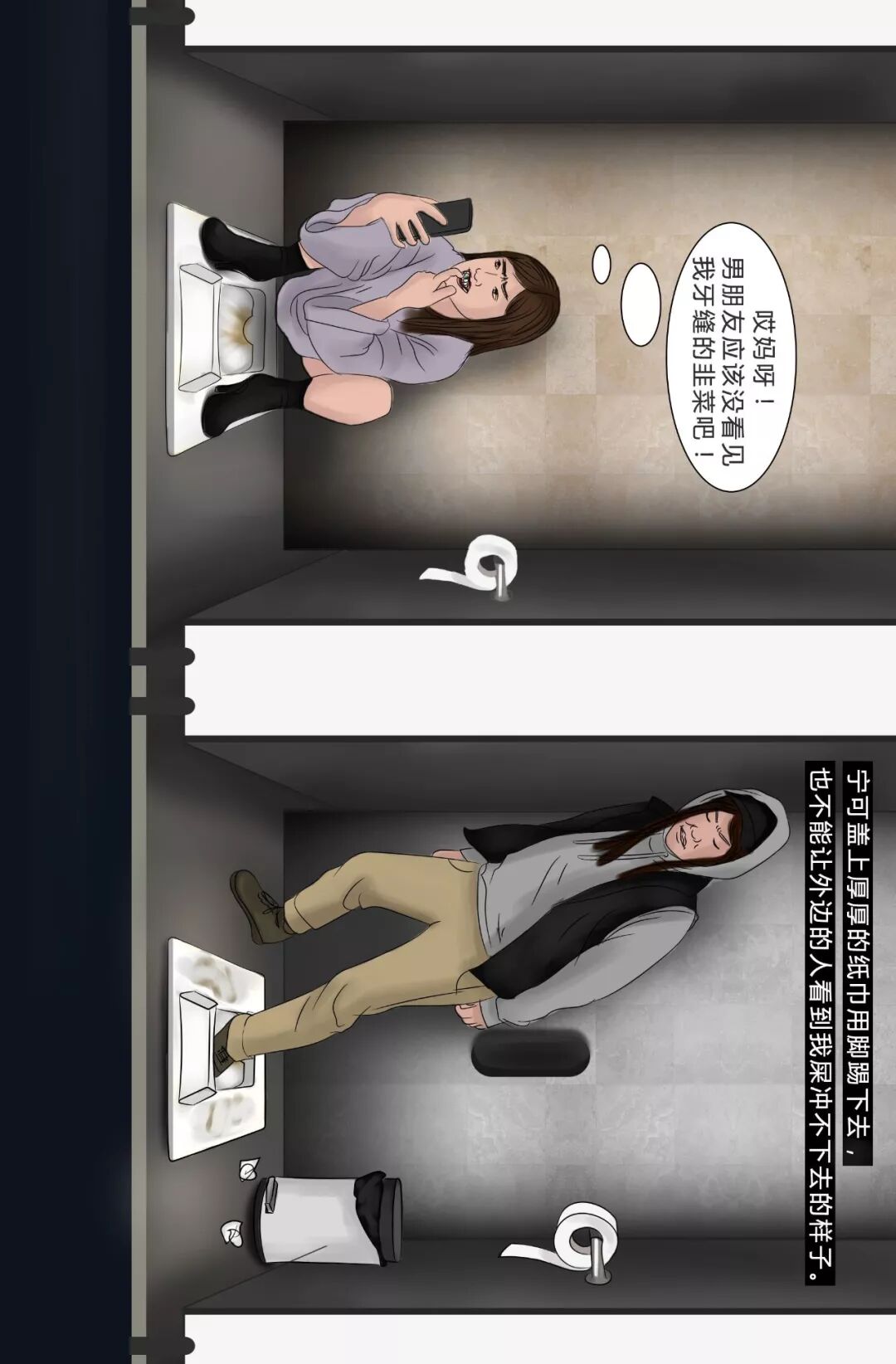 每次上厕所的时候我都在想,距离我不足一米的隔壁间里是什么人,听着隔壁窸窸窣窣的声音,猜测她正在干什么。
