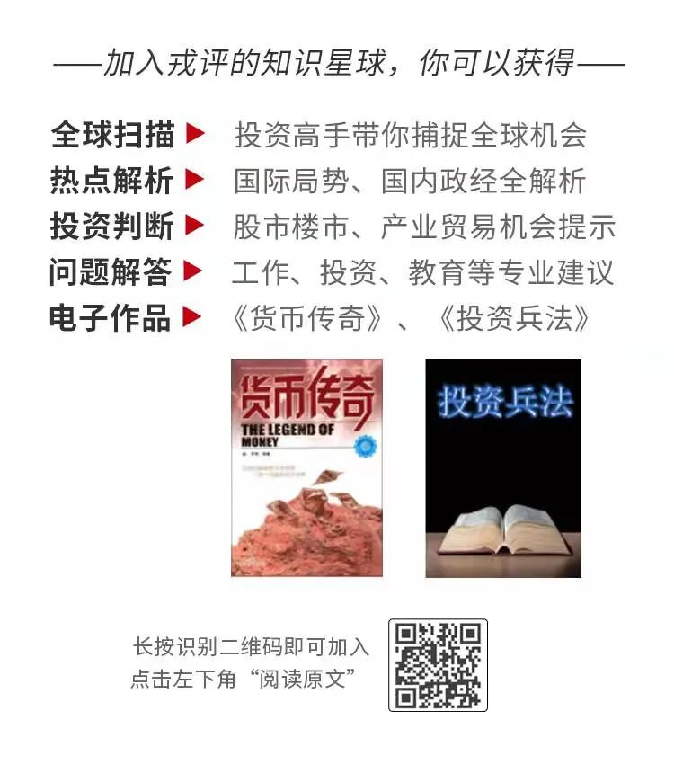 戎评刚刚创建了知识星球【戎评】,加入即可享受戎评第一时间为你带来的全球国际局势热点解读、各种投资理财分析、还有戎评原创作品《投资兵法》下载及一对一答疑服务。原价499元每年,现促销价399元每年,来知识星球和戎评聊聊天吧!识别下方二维码即可以加入!
