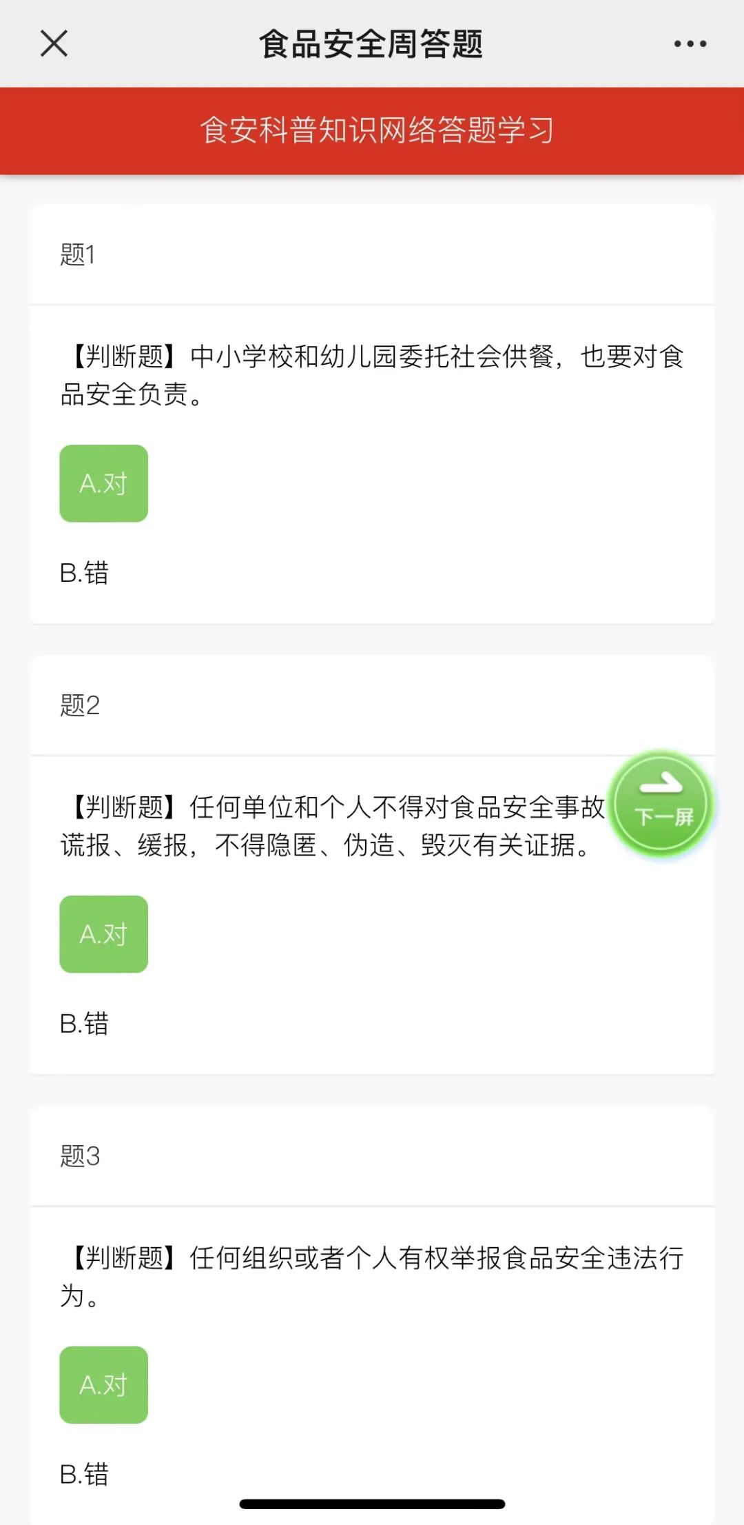 即可进入“食安科普知识网络答题学习”