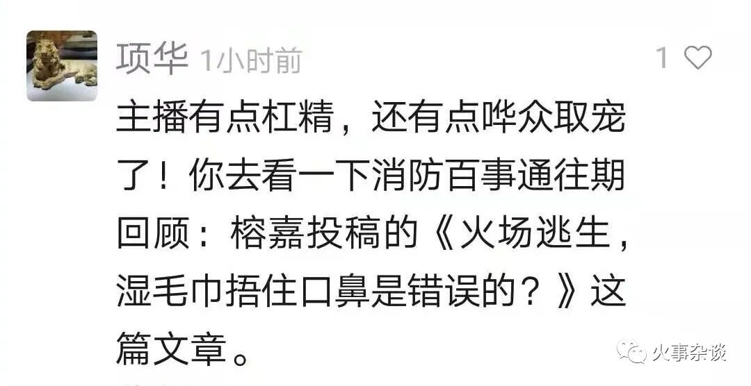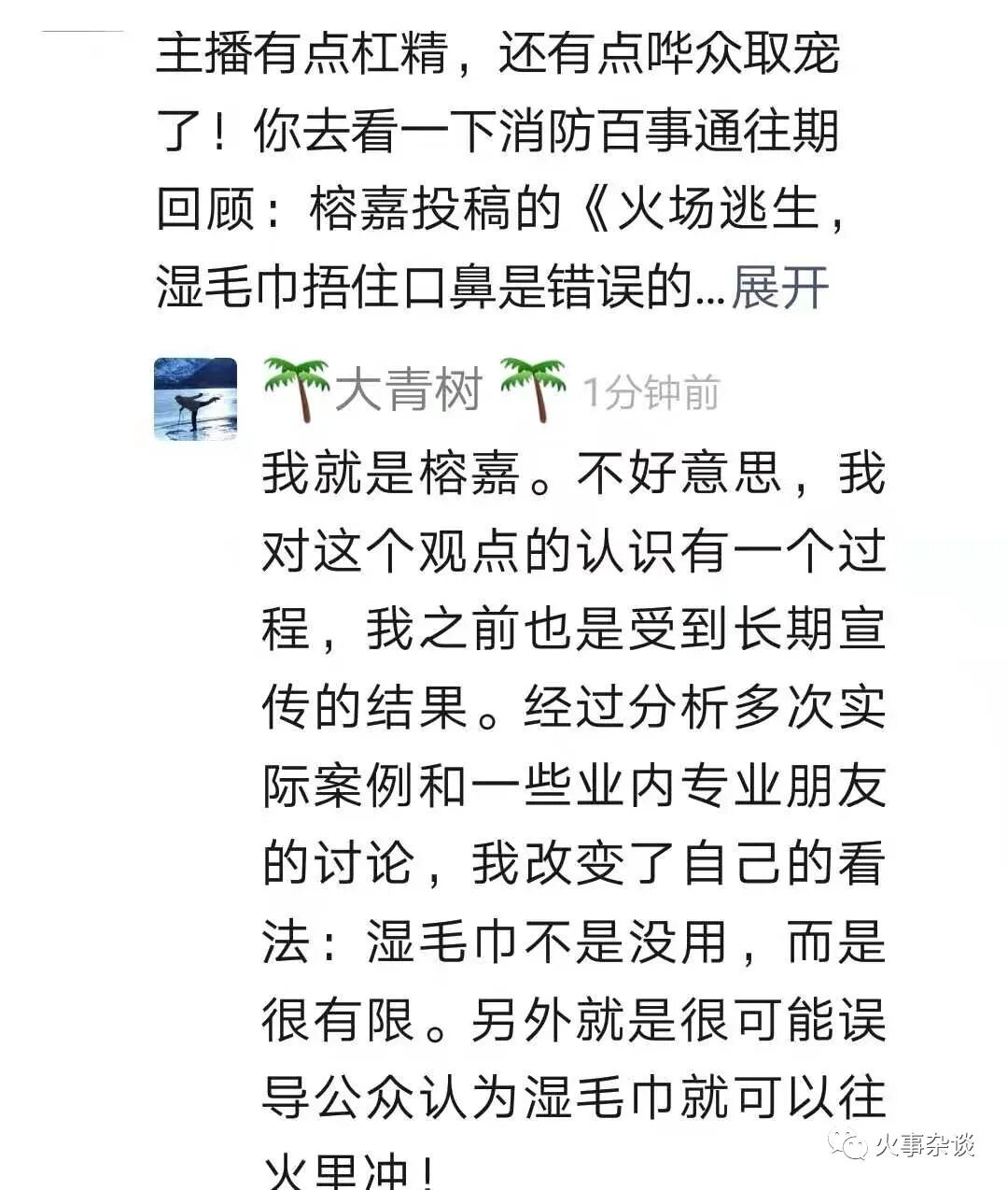 前几天,我录制了一段视频,想再呼吁一下简单宣传湿毛巾可能存在误导。视频发出来后,中国消防科普、消防百事通都进行了转发。这本来是好事,没成想,竟然受到侮辱和诽谤。