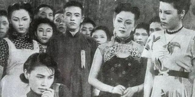 ▲《一江春水向东流》剧照。矮很多人一头的这个就是白杨,斜眼看她的是上官云珠,最右边那个高个子是舒绣文