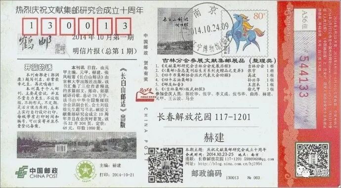 1、明信片报2014年10月第一期(总第1期)。主题是“庆祝文献集邮研究会成立十周年”,内容有《长白山邮话》出版、吉林分会参展文献集邮展品(整理类)、开篇的话等,2014年10月24日在南京首发。载体是2014年邮政贺卡正面,单色激光打印,带有打印时间和编号。目前最大编号是394,2016年10月29日打印。