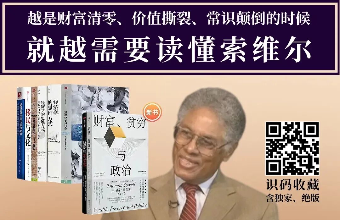 “正如过去许多人警告过的那样,自由不可能一下子公开地消失。它更有可能被金光闪闪的承诺和高尚的理念一点一滴地侵蚀。” 无论东方还是西方,索维尔的作品是对现实社会,都是最具有价值的,他用事实和一个个的小故事讲出被扭曲的真理,针对普通民众的常识启蒙,也可称之为反洗脑。而这也是他最大的社会责任感。为此,人文英华&先知书店诚挚推荐“索威尔作品集”(含绝版、独家),越是价值观撕裂、财富清零的时候,我们就越需要读懂索威尔,识别下图二维码,即可一键收藏。