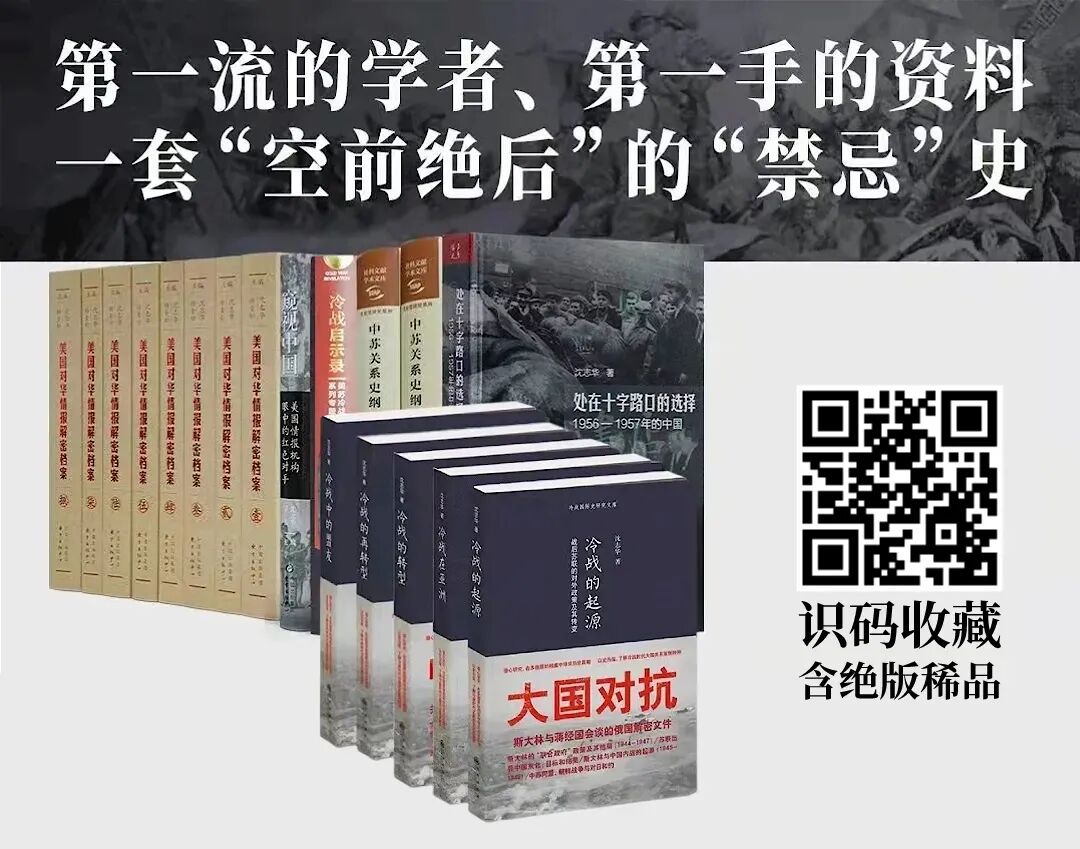 但遗憾的是,沈志华老师的作品,越来越难买到,为此,先知书店特别集齐汇编了包含《冷战五书》《中苏关系史纲》《美国对华情报解密档案》等书在内的“沈志华迄今最全作品集”(6部18册,含稀品),极具收藏价值。识别下图二维码,即可一键收藏。