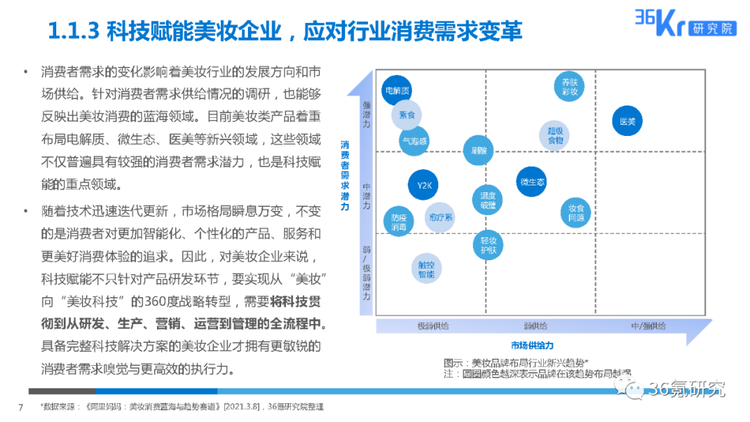 美妆个护的发展基于科学实践,发展历程中向来不乏与高科技的碰撞、融合。随着大数据、人工智能等前沿技术的不断迭代,美妆与科技的融合往纵深发展,衍生出更多应用场景。据36氪研究院预测分析,科技赋能下的美妆行业将迎来爆发,市场规模将在2025年达到一万亿元左右。同时,科技将为美妆行业提供全方位、多角度、全链条的改造和提升。其中,以生物科学为主的前沿技术将持续助力美妆创新产品研发生产;AI与大数据、增强现实、IoT等技术的结合将加速虚拟试妆发展、推动定制化美妆产品时代到来;企业供应链管理也将向数字化、智能化迈进。