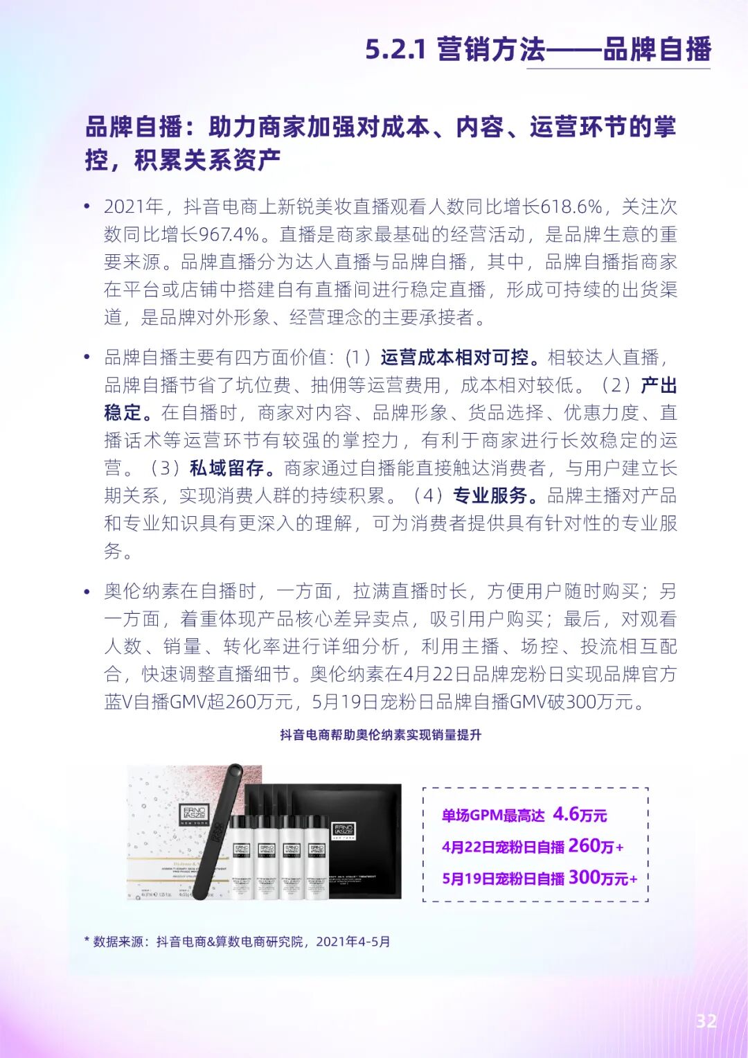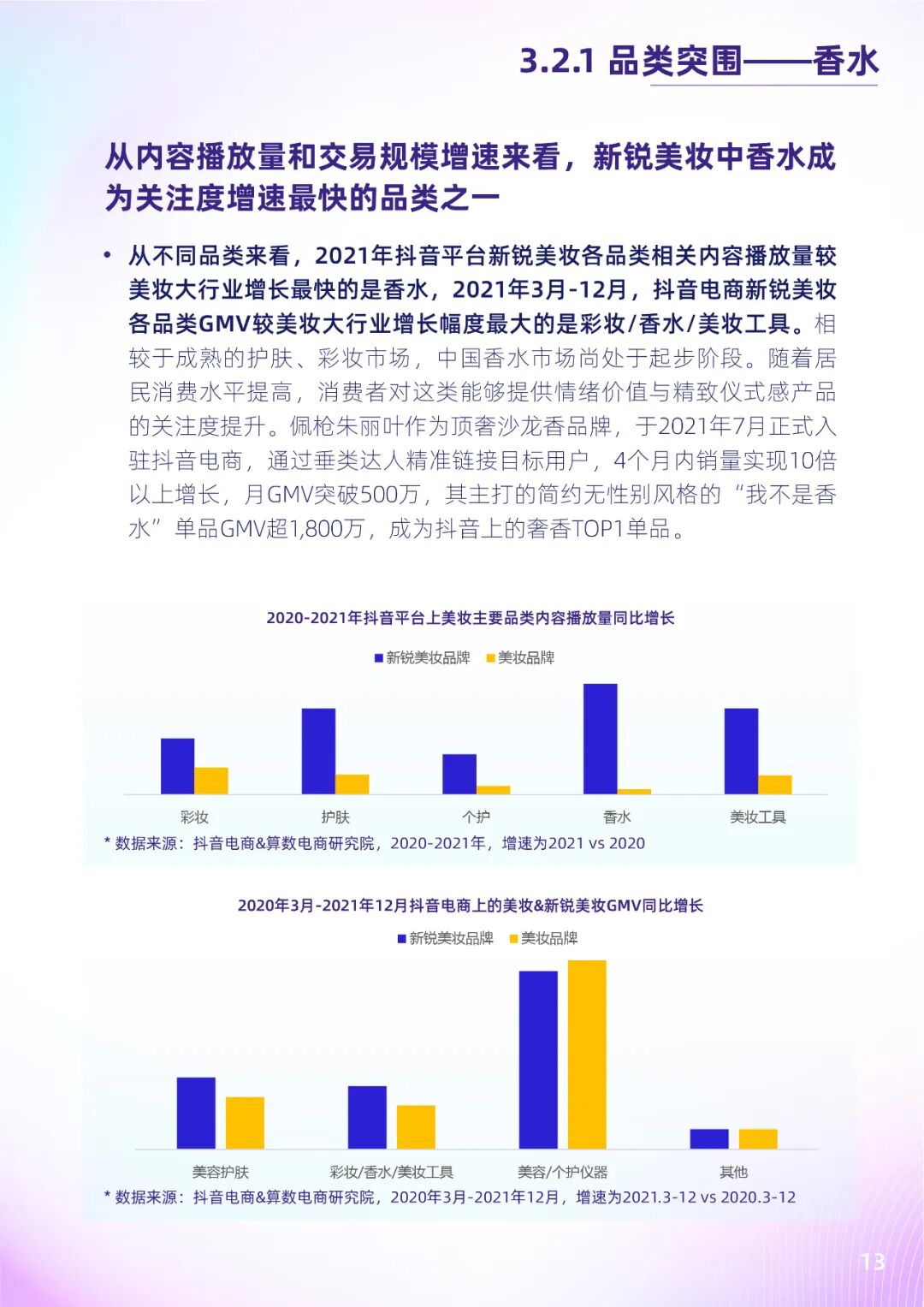 抖音电商新锐美妆发展整体上呈增长趋势,发展速度高于美妆大行业。算数电商研究院数据显示,2021年,抖音平台上新锐美妆万粉以上达人数量增速达36.4%;新锐美妆相关内容播放量同比增长42.6%,超过其他美妆内容播放量;2021年3月-12月,新锐美妆GMV同比增长超8倍。