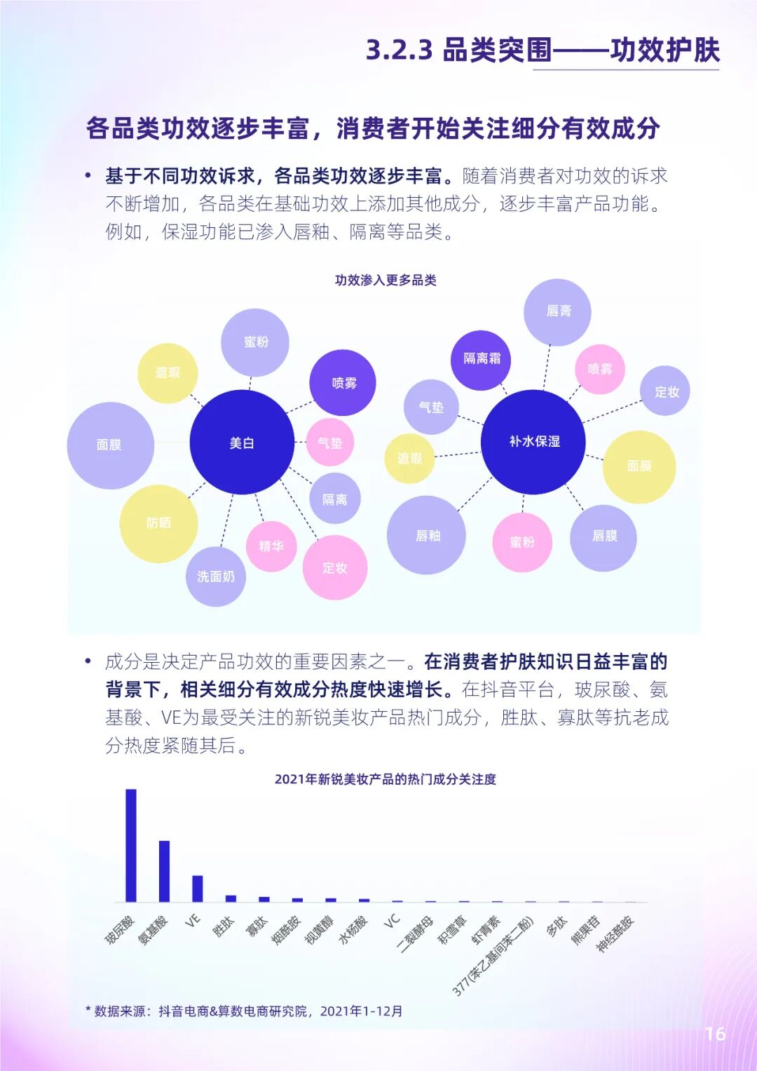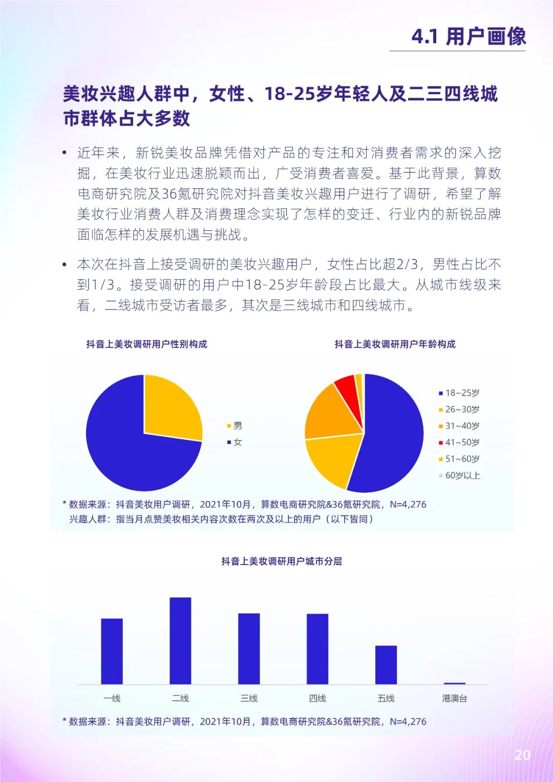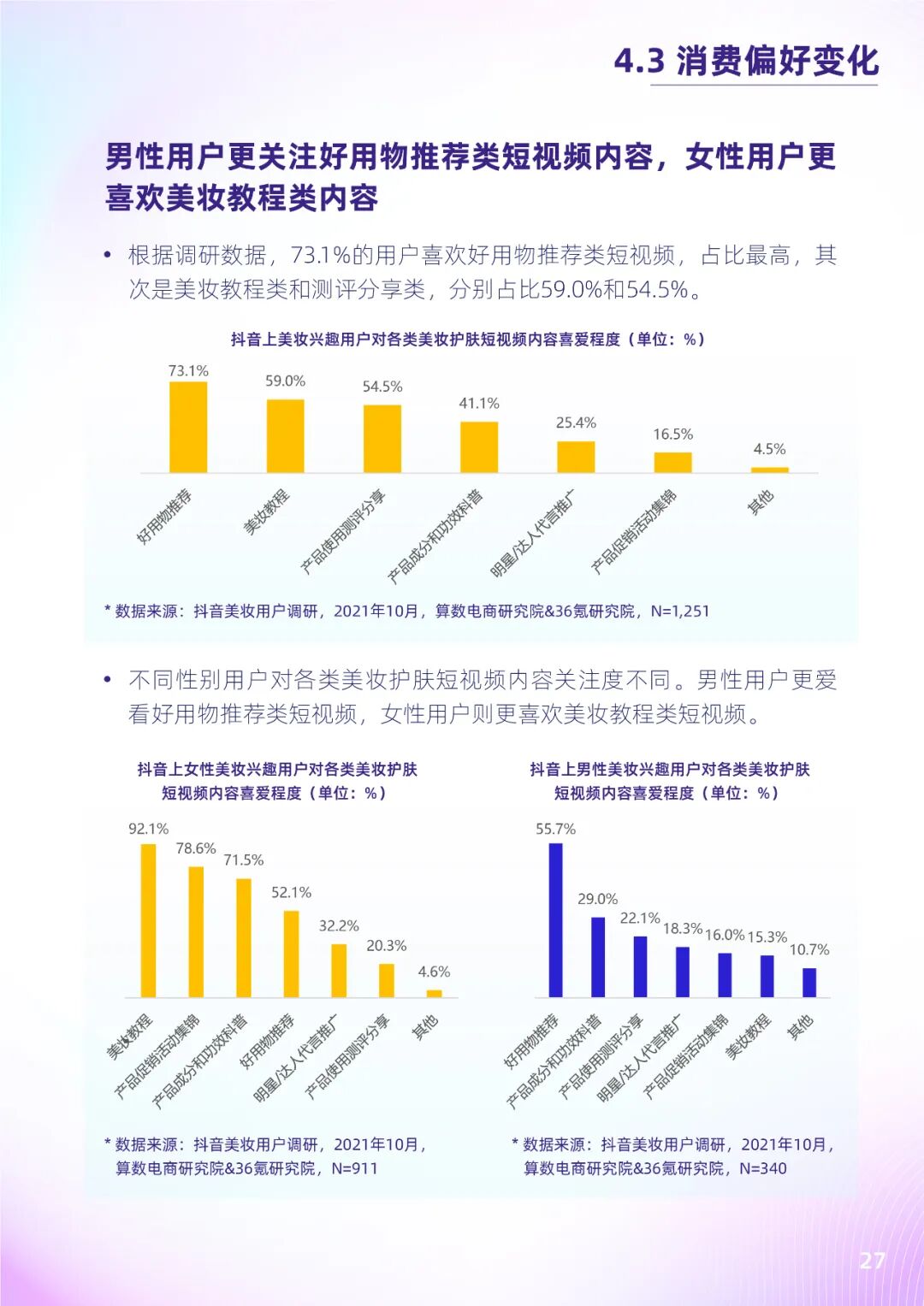 根据算数电商研究院&36氪研究院抖音美妆兴趣用户调研数据,护肤及化妆已不再是女性专属行为,男性爱美意识的不断觉醒,进一步拓宽了美妆行业的增长空间。而透过相关购买行为可发现,注重产品实用性、性价比的年轻消费者,更偏爱新锐美妆品牌,且常通过抖音等内容平台种草及购买相关产品。其中,国内新锐品牌的化妆水、面膜、防晒等基础护肤品类和唇妆、眼妆、定妆类等热点彩妆品类最受欢迎。未来,新锐美妆品牌将进一步受到消费者关注与认可,兼具质量和性价比的新锐美妆品牌将进一步抢滩市场。