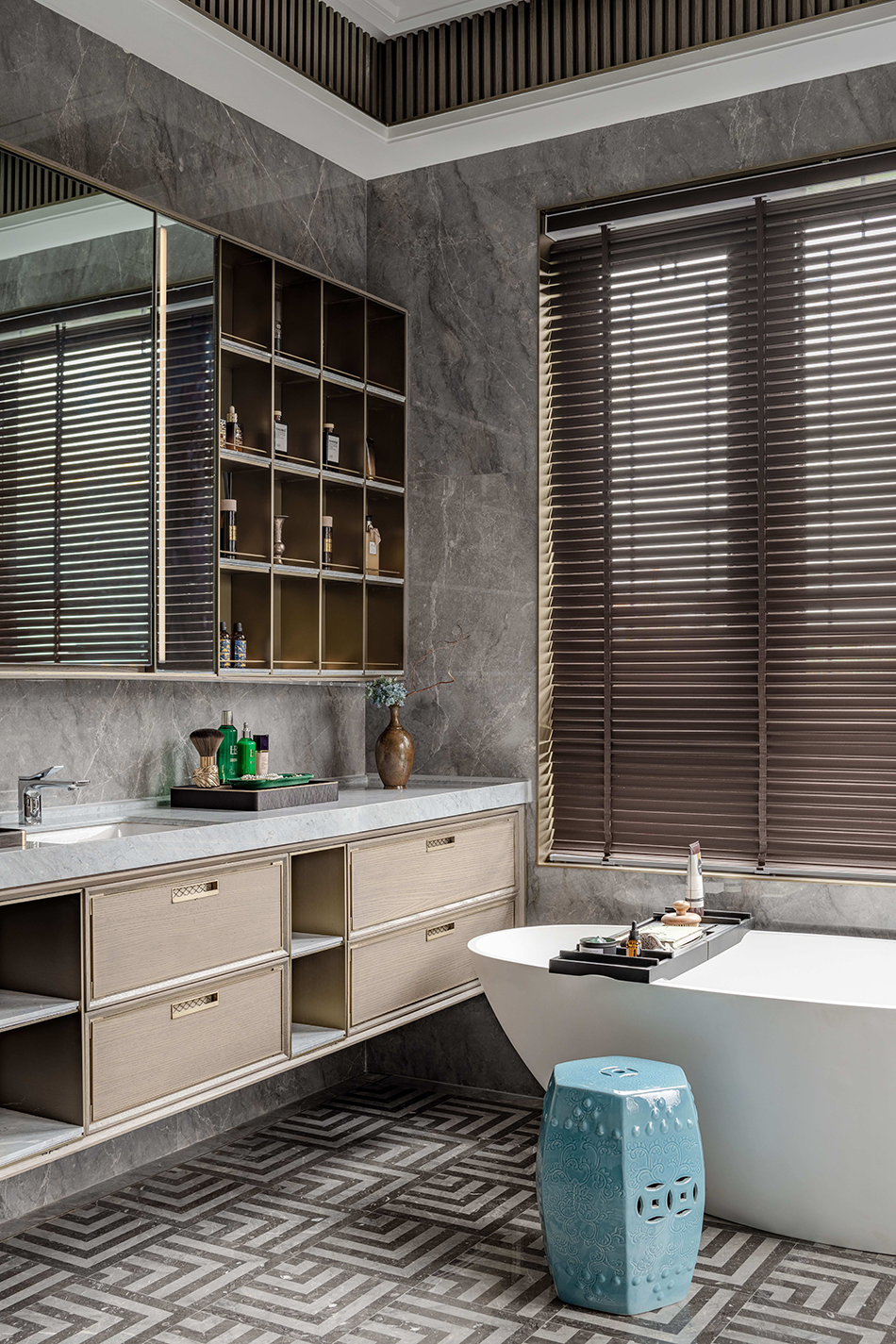 整块石材磨制的平滑台面,低调中流露出对品质孜孜不倦地追求;镜柜背藏收纳,便于陈放洗漱及相关用品。定制中式风格的洗手台,内嵌拉手造型巧妙,底部以云纹蚀刻雕花饰之。一个东方意蕴同现代设计交织的人文空间——借鉴古典园林及建造,布局灵巧,移步易景;前厅、客厅、餐厅及多个空间,组合有序,如叠山理水,一气呵成。