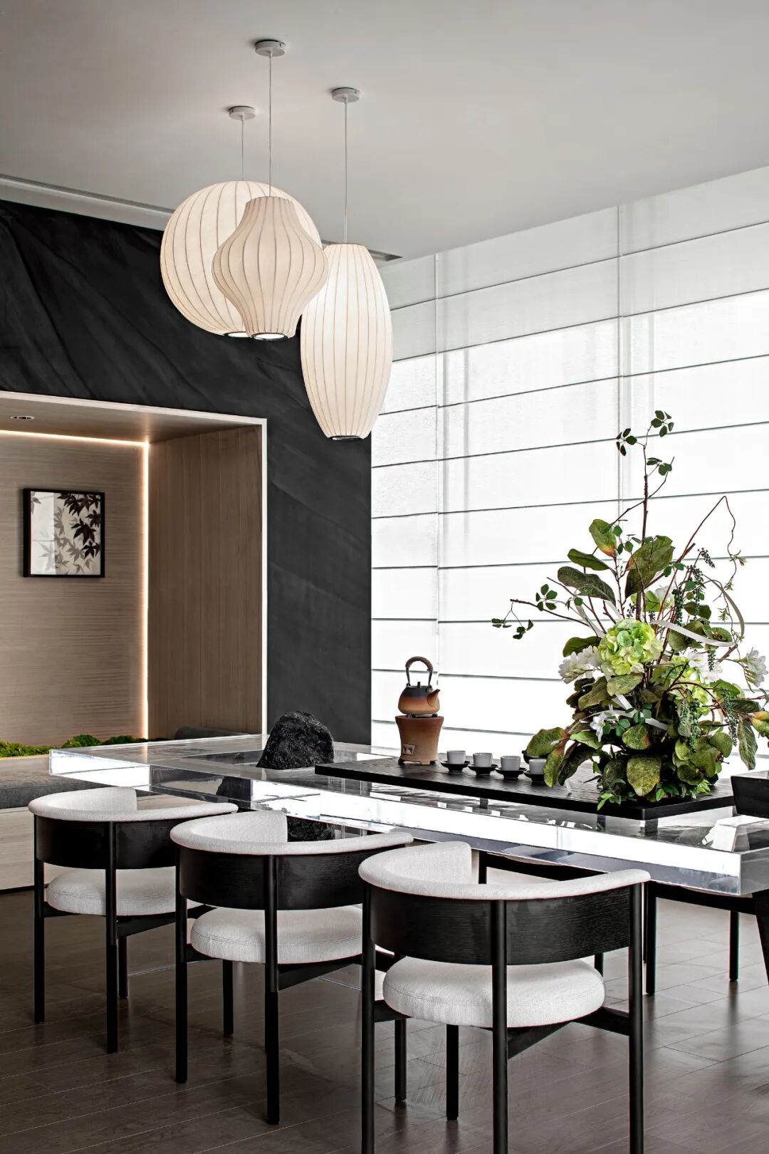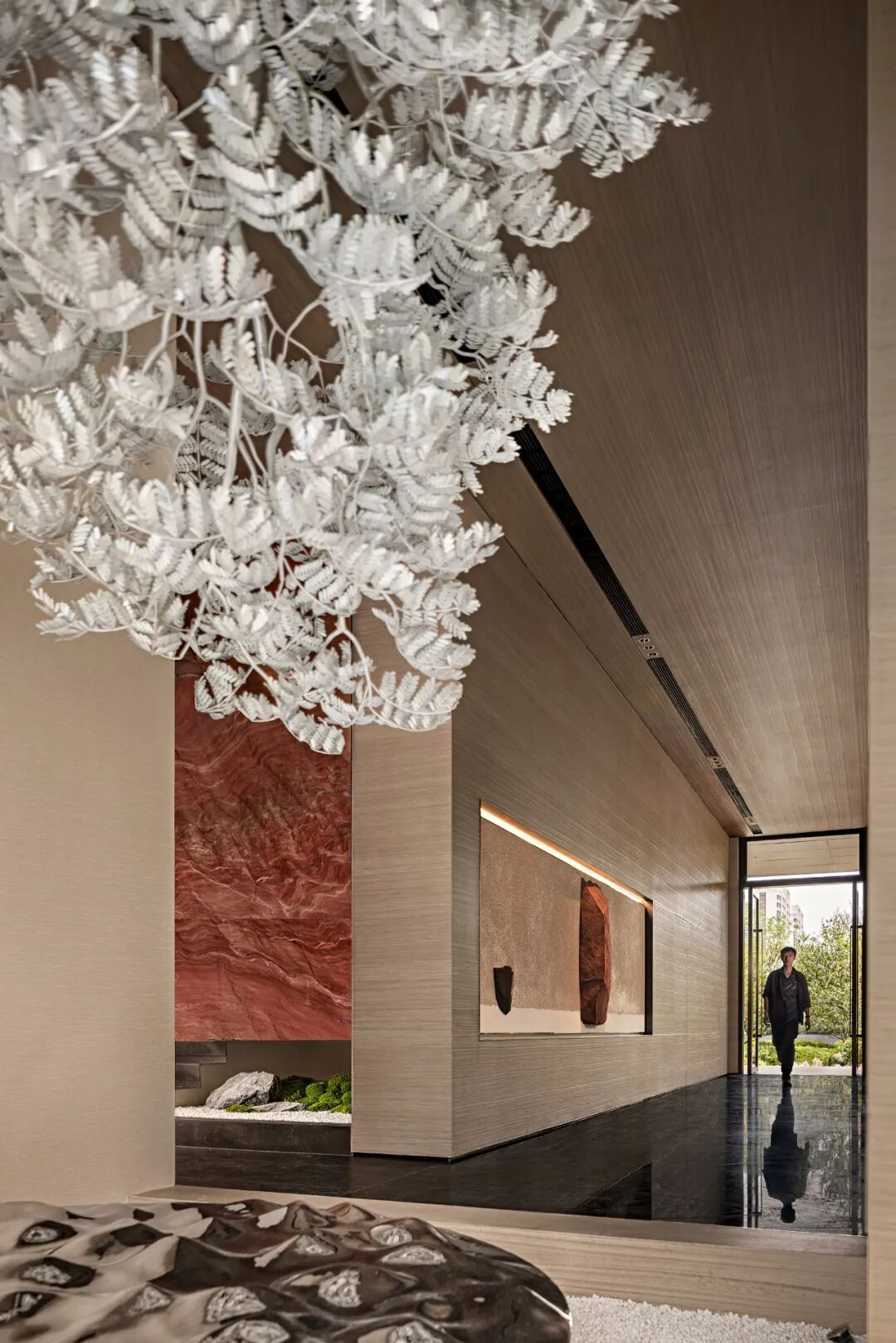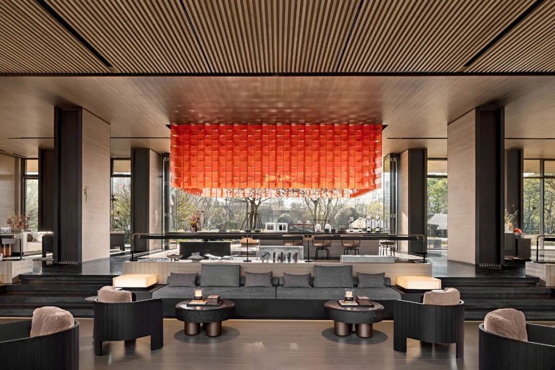 Entering the lobby, the double-height wood-grained slate partitions come into view in an orderly manner, forming a sense of vertical extension of the space. The circular lamp at the reception desk falls from the ceiling, which hides the wind and gathers the air, and is simple and Zen.