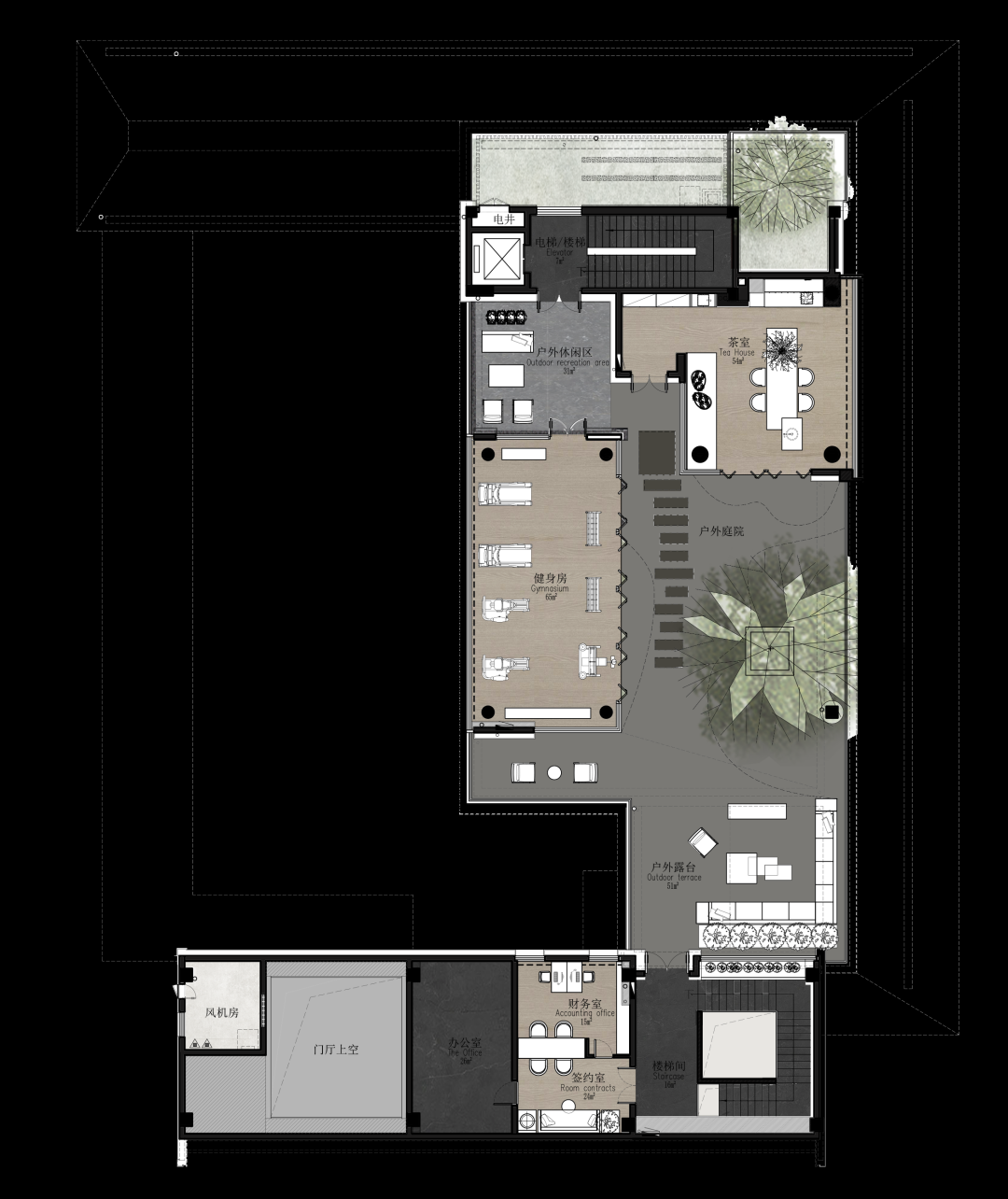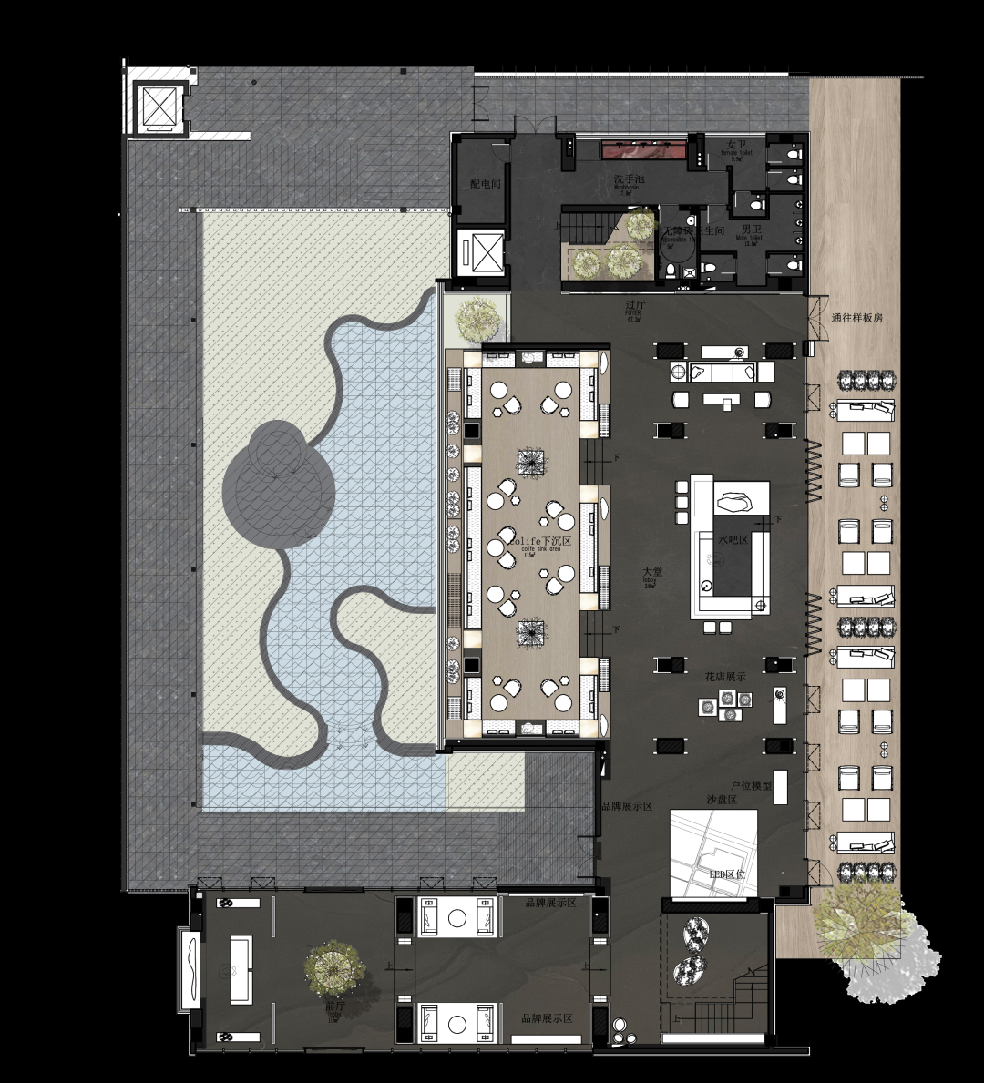 将室内洽谈区延伸到室外,打造与自然零距离的休闲庭院,营造繁华都市下回归生活的宁静感受,将室内空间的装饰氛围延伸,于自然、空间与人的交互中重组空间秩序,打造都市宜居生活范本。