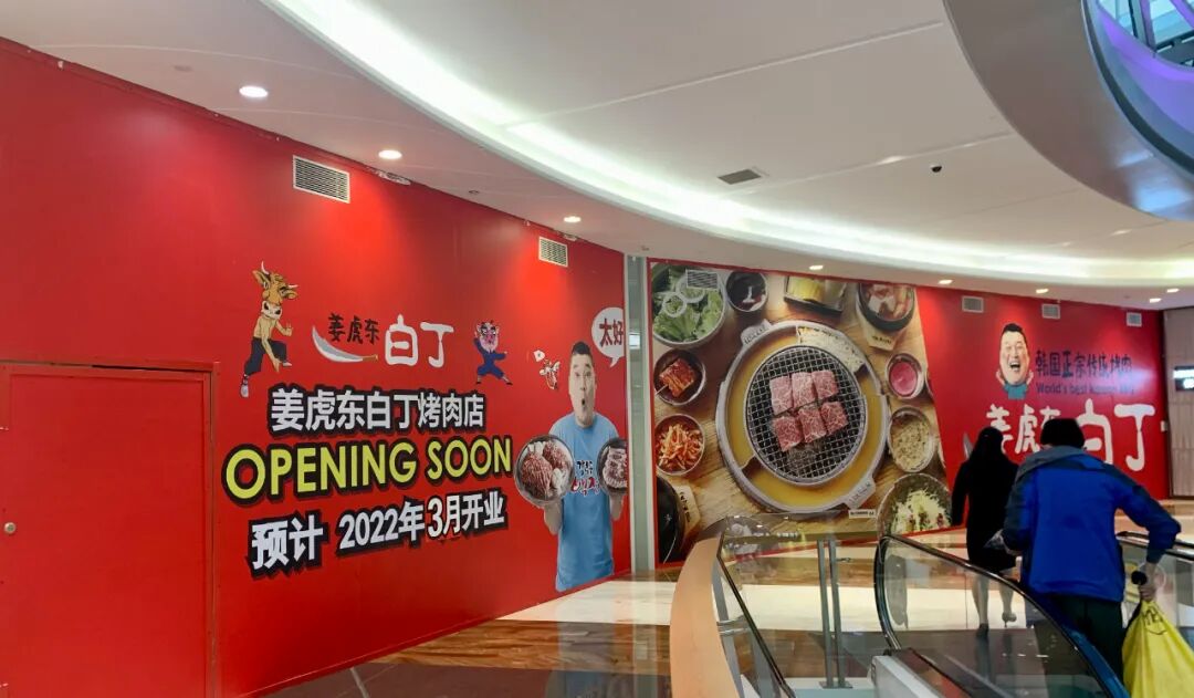 铱星云商现场走访发现,KK MALL场内围挡并不多,且大多未释放新品牌信息,仅用作商场理念宣传或品牌广告宣传。可以通过现场直观了解到的新进品牌为姜虎东白丁烤肉,预计3月开业。