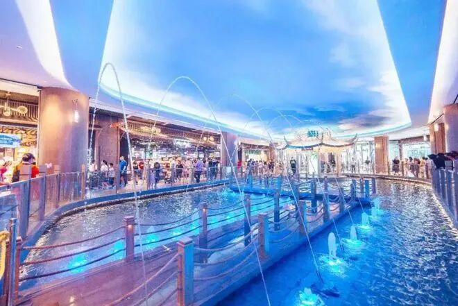 例如南京建邺广场的秀河坊,其创作灵感汲取自的南京母亲河——秦淮河,在室内水街的场景打造上,提取秦淮河两岸的廊、轩、阁元素融入空间,串联船坞灯市、曲溪轩流、摩扇亭三大特色场景,中间穿插了烟水桥、隙月桥、文枢桥、花雪桥四大特色连桥,巧妙还原了具有老南京记忆的文化场景。