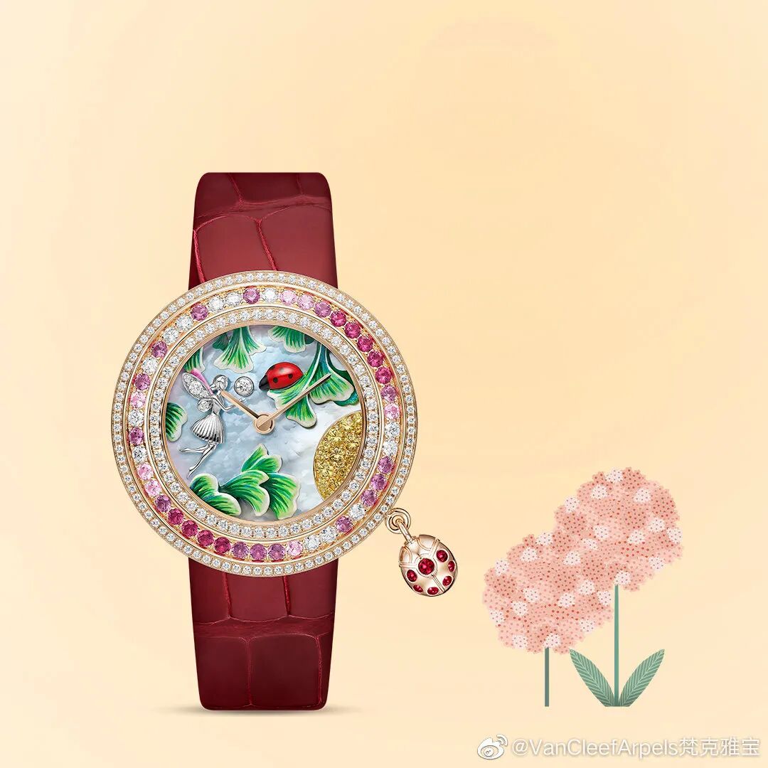 Lucky Spring系列以瓢虫和花卉主题图案,致敬Van Cleef & Arpels梵克雅宝所珍视的主题——万物复苏的春季。此系列作品采用玫瑰金、红玉髓和缟玛瑙打造,尽显丰富多彩的自然风情。Charms Coccinelle Féerique腕表装饰图案采用金质、钻石、蓝宝石、珍珠母贝和珐琅,并巧妙结合细工彩绘工艺,描绘“仙子与瓢虫”邂逅的场景,呈现出浪漫活力。