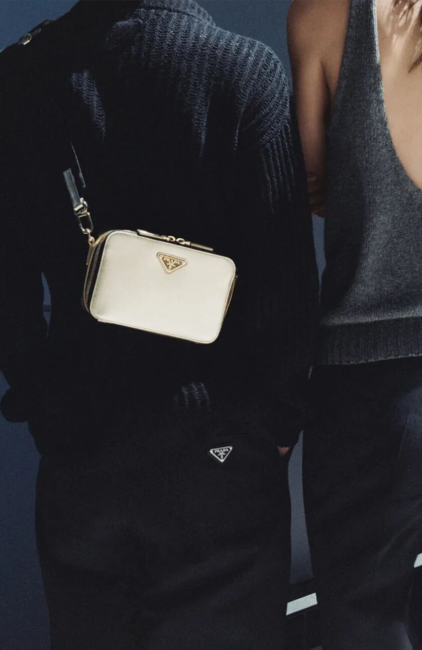 最具人气的Re-Edition Hobo包包以轻盈的绸缎面料制作,通体镶嵌璀璨的水钻成为亮点,搭配金色珐琅三角包扣,吸睛力十足;灵感来自品牌经典三角徽标的三角形迷你包,饰有2个拉链袋,搭配可拆卸金属链条和皮革肩带,造型精巧又醒目。此外,该系列还带来了男士斜挎包,采用金色 Saffiano 皮革制成,三角徽标点缀黑色珐琅,黑金组合彰显高级感和层次感。