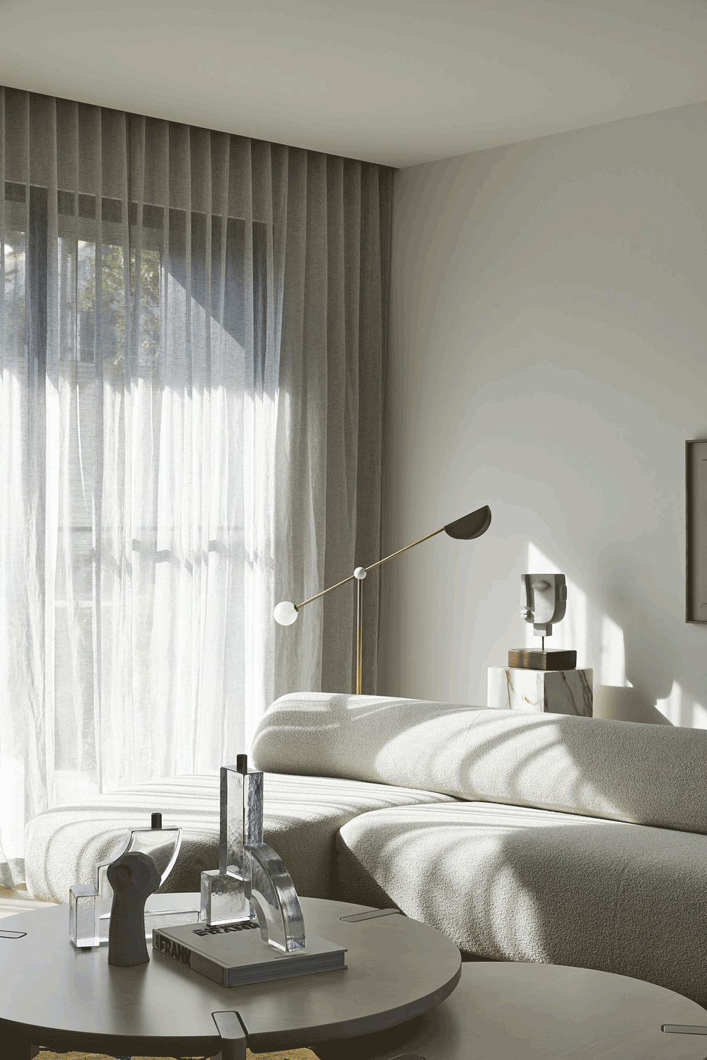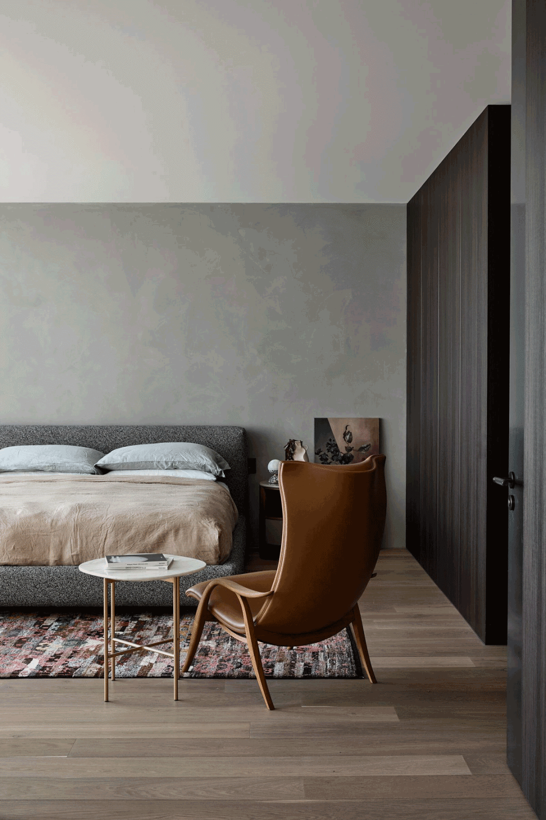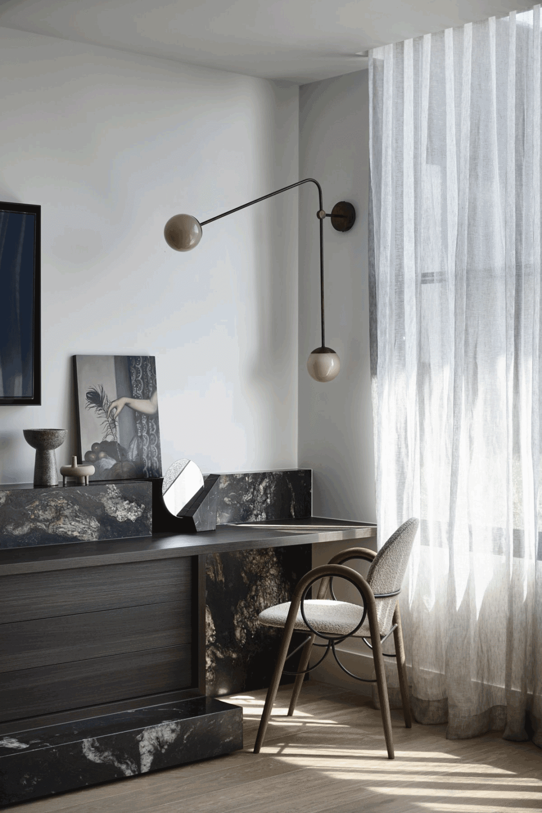 卧室,一方大理石与一黑色书几组合,形成一半开放式办公区。右后侧以一纱帘过滤刺眼阳光。棕灰调的配色幽静而深远,简约的陈设有助于舒缓心劳,休憩入睡。
