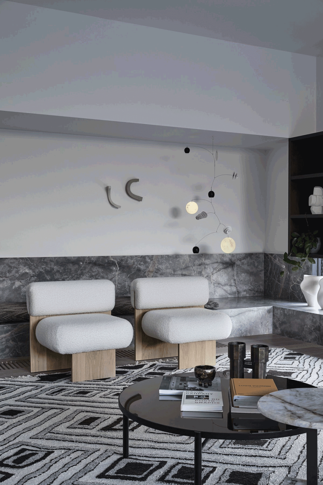 While the decorative brief wasn’t overly prescriptive, there was a request for yellow to be incorporated into the space, and Haag’s solution was a large gold and black patterned floor rug. Excerpt for that, there’s a slew of artwork, ceramics and sculptures from Australians artists.