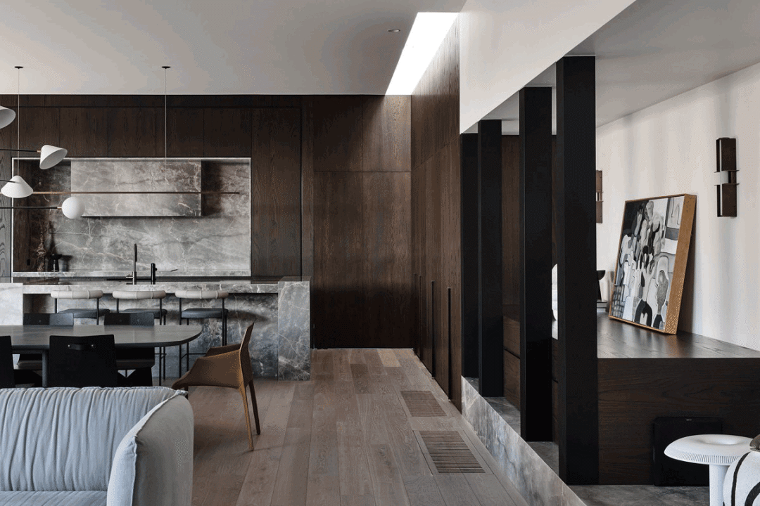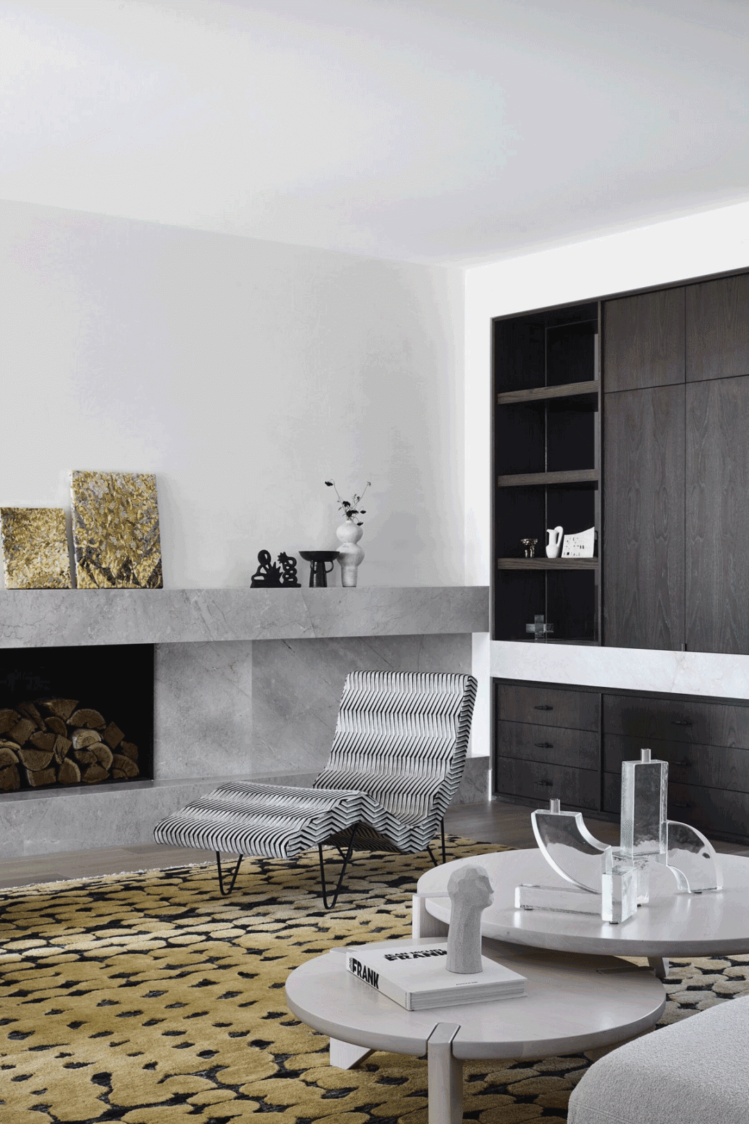 房主对软装的要求并不严苛,就这方面只提了一个要求——将黄色融入空间。Haag的解决方案是在地板上铺上一块饰有金黑连缀图案的大地毯。除此以外,这里还有许多来自澳大利亚艺术家的艺术品、陶艺和雕塑。