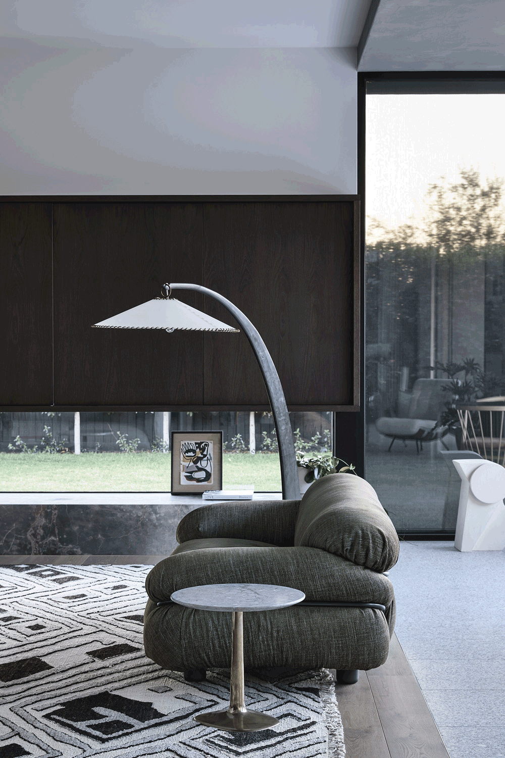 Standout pieces include the Ball and Shade pendant in Circle over the dining table, an oversized vintage floor lamp in the informal living area and vertical pendant dangling in the entryway. Natural light was just as important though, and from every room there’s a view to the outdoors.