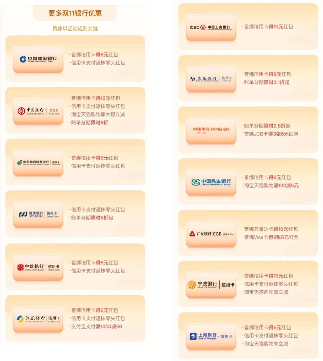 而且这次双十一期间,除了淘宝天猫的优惠活动外,支付宝和各大银行信用卡还推出了不少好玩的活动,不仅限于分期免息。