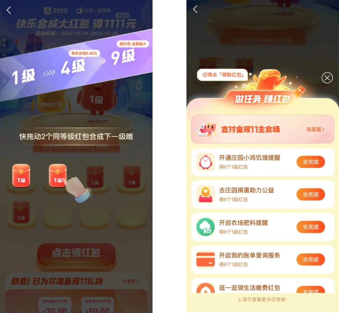 合成大红包有一个简单的玩法:做任务攒够同一级两个红包,可兑换下一级红包一个,是不是很像「2048」?合成到 4 级以上就可以兑换了,如果升到 9 级将可以获得最高 1111 元的兑换券,可以换成信用卡红包。任务也都挺简单的,和养猫差不多,包括逛逛双十一主会场、捐绿色能量保护绿地等等。