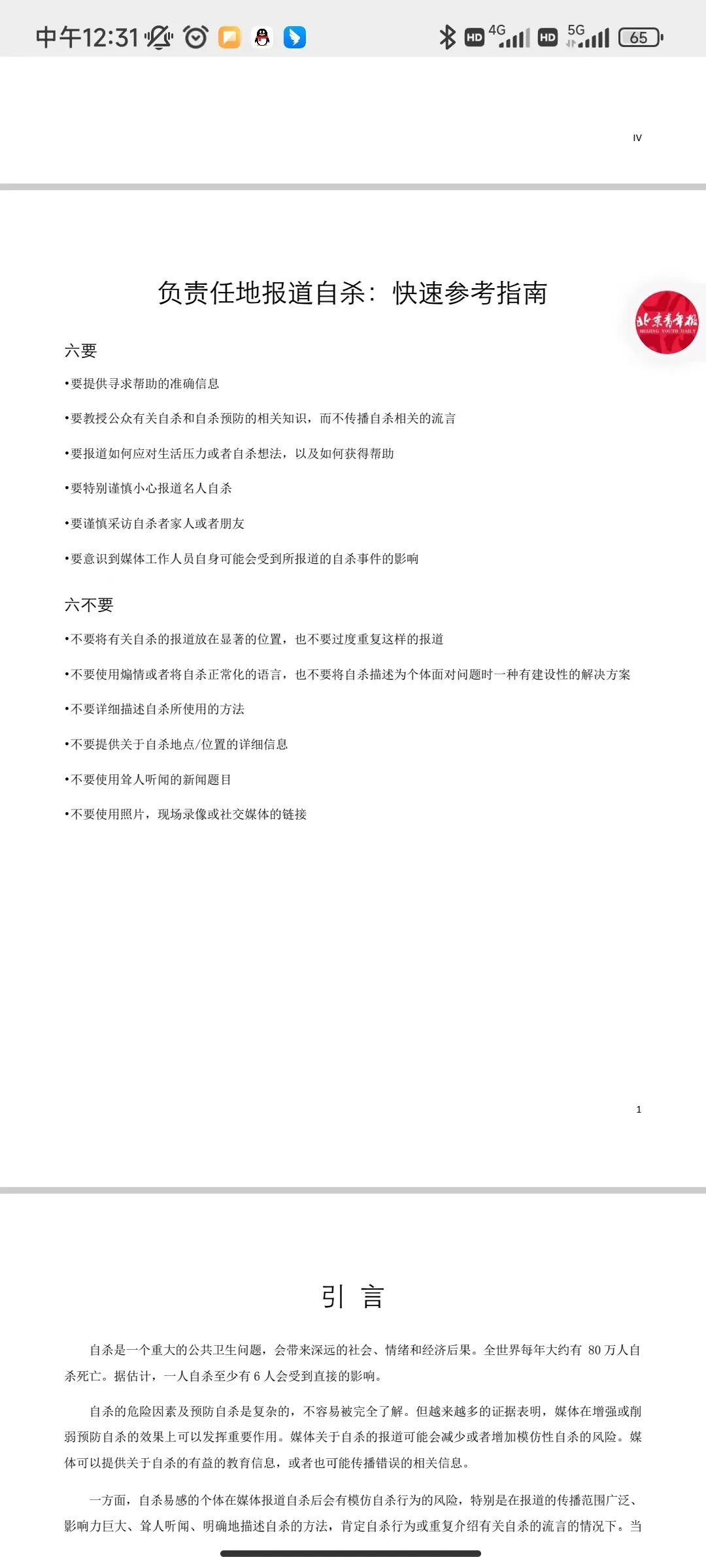 恰好,2021年前后,我从北京回龙观医院得到了一份《预防自杀:供媒体工作者参考》的文件,该《参考》原著为世界卫生组织和国际预防自杀协会,这份《参考》中的内容对于媒体报道自杀事件有了较为明确的指引,其中很多内容都值得媒体同行借鉴和参考。